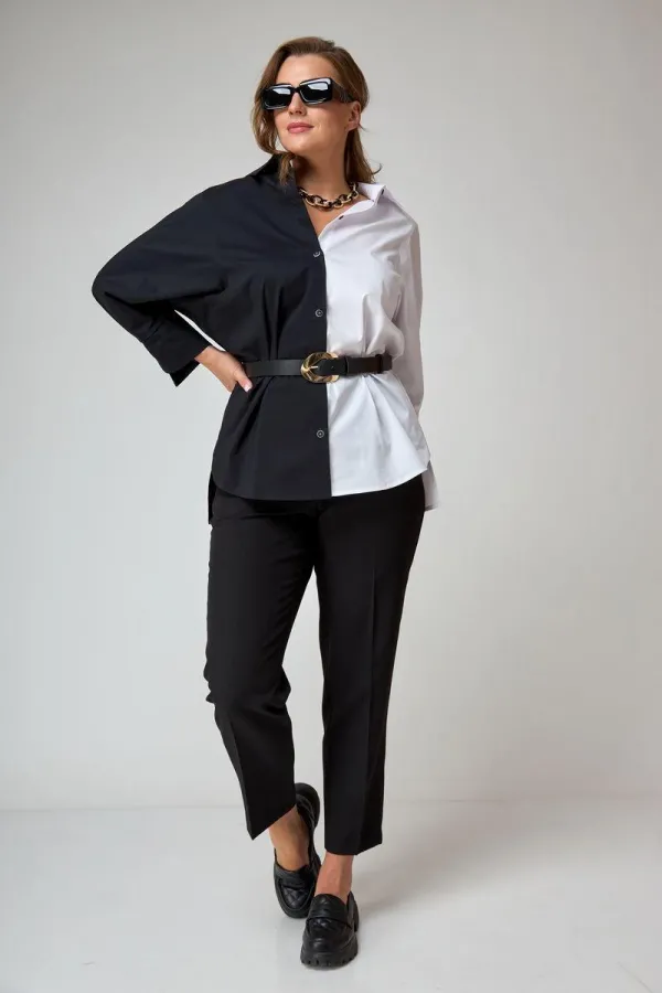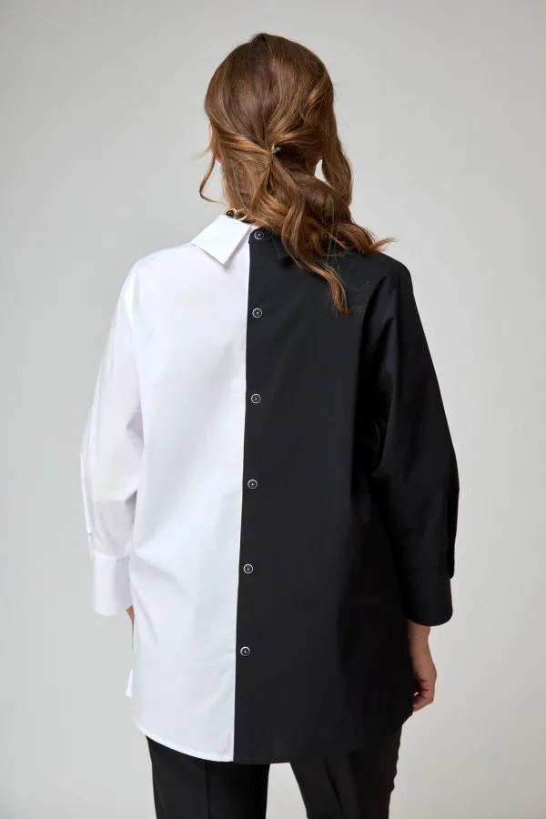 Рубашка женская свободного силуэта с застежкой спереди и сзади на петли и пуговицы на притачных планках и стояче-отложным воротником, рукава рубашечного покроя на квадратной пройме, по низу рукавов притачные манжеты фигурной формы с пуговицами. Рубашка выполнена из высококачественного смесового хлопка 2 цветов-съёмные части при стирке.