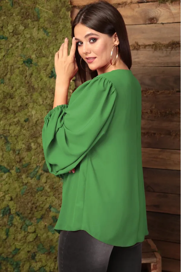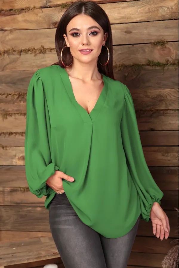 Блуза женская, полуприлегающего силуэта. По полочке идет нагрудная выточка из бокового шва. Вырез V-образной формы с планками и складкой по центру. По спинке средний шов, рукав обьемный, по окату сборка. Низ рукава фигурный, на резинке. Длина спинки: (50-52)-71см., (54-58)-72см. Длина рукава:(50-52)-58см., (54-58)-59см.