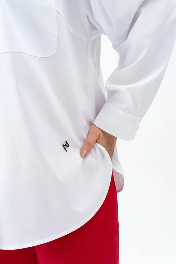 Рубашка женская выполнена из 100% хлопковой ткани, с отложным воротником на стойке, с центральной застёжкой на петли и пуговицы. полочки с нагрудными вытачками с накладными карманами к клапанами, застёгивающиеся на петли и пуговицы, рукава рубашечного кроя, с притачными манжетами, застёгивающиеся на петли и пуговицы. спинка цельная, по бокам обработаны разрезы.