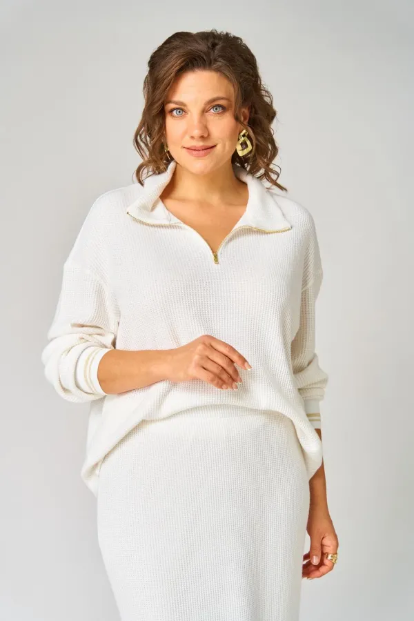 Трикотажный женский джемпер с воротником-стойкой на молнии — это идеальный выбор для создания стильного и уютного образа в прохладное время года. Изготовленный из мягкого трикотажа, в состав которого входит смесовая вискоза, этот джемпер приятно облегает тело и обеспечивает максимальный комфорт. Свободный прямой крой со спущенной линией плеча создает расслабленный силуэт, который идеально подходит для удобной носки и позволяет свободно двигаться. Длинные рукава на манжетах с полосками добавляют изделию изысканности и стиля, а также защищают от холода. Воротник-стойка на молнии не только добавляет оригинальности, но и позволяет регулировать тепло, что делает этот джемпер универсальным элементом гардероба. Он отлично сочетается как с брюками, так и с юбками, позволяя создавать разнообразные образы для разных случаев — от прогулок, праздников до встреч с друзьями или даже для работы в офисе.