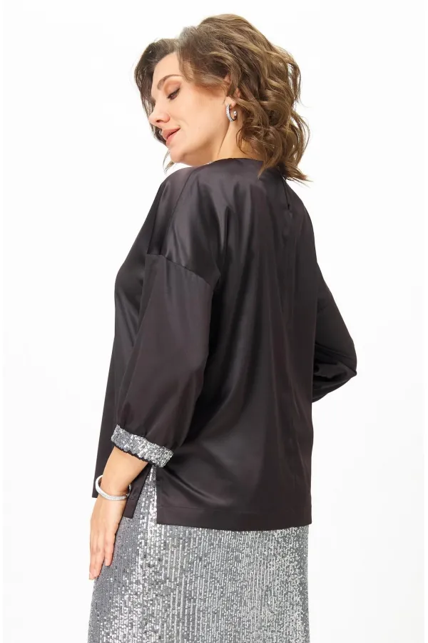 Классическая женская блузка остается неизменной классикой, неподвластной времени. Нарядная блузка выполнена из атласа с отделочным воротником и манжетами из пайеток, подойдет не только для праздничного мероприятия, но и для повседневной носки. Черная блузка с рукавом длины ¾ это всегда беспроигрышный вариант, поможет скрыть любые недостатки фигуры и подчеркнуть её достоинства. Свободный укороченный крой блузки не сковывает движения. Классический цвет делает модель универсальной и любимой вещью вашего гардероба.