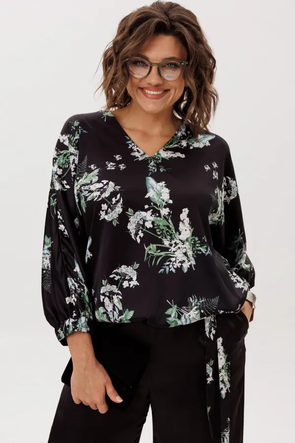 Особую динамику и индивидуальность блузе придают детали: цельнокроеные рукава три четверти подчёркивают целостность и плавность линий, а притачной пояс и манжеты, собранные в нежную сборку благодаря эластичной резинке, создают выразительный контраст с текучестью основной ткани. Эта умная конструкция позволяет вам самостоятельно регулировать длину блузы, творчески преобразуя её силуэт — от парящего и расслабленного до более собранного и чёткого.