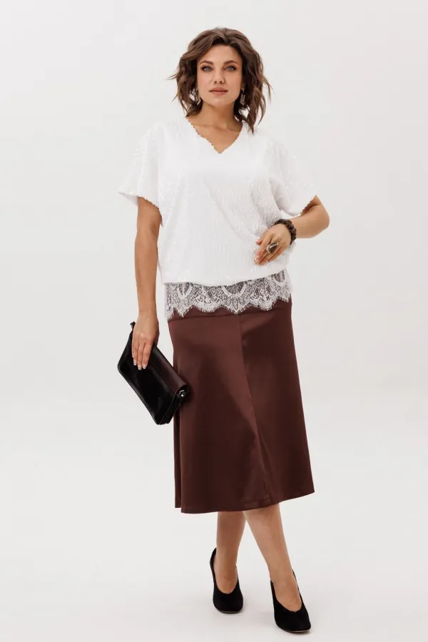 На модели в топе цвета «кристаллики льда» атласные брюки 1737, юбка 1510, блузон в пайетки 1522 и жакет 1661.Размер 52: ОГ-112; ОБ-116; ДИ-67;