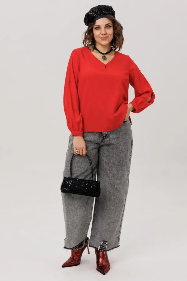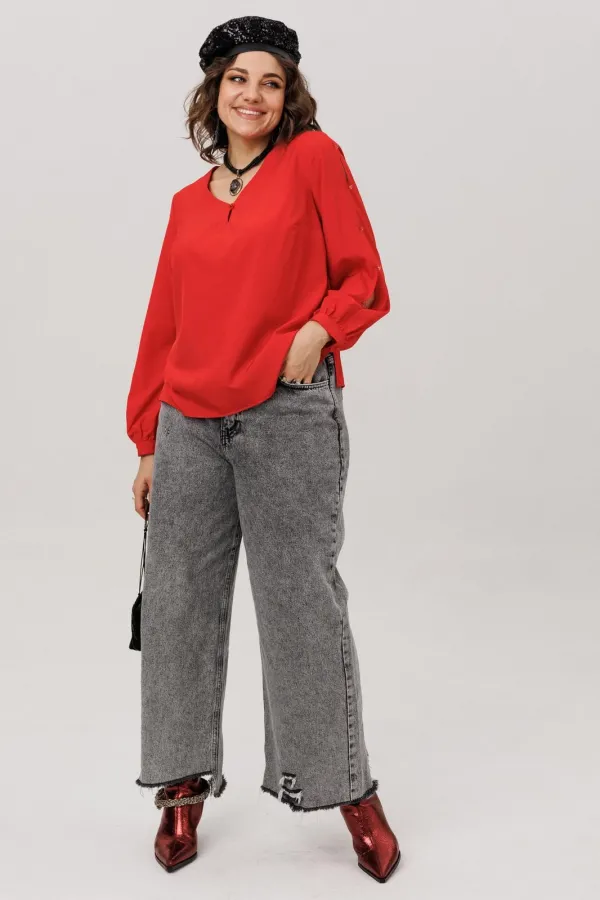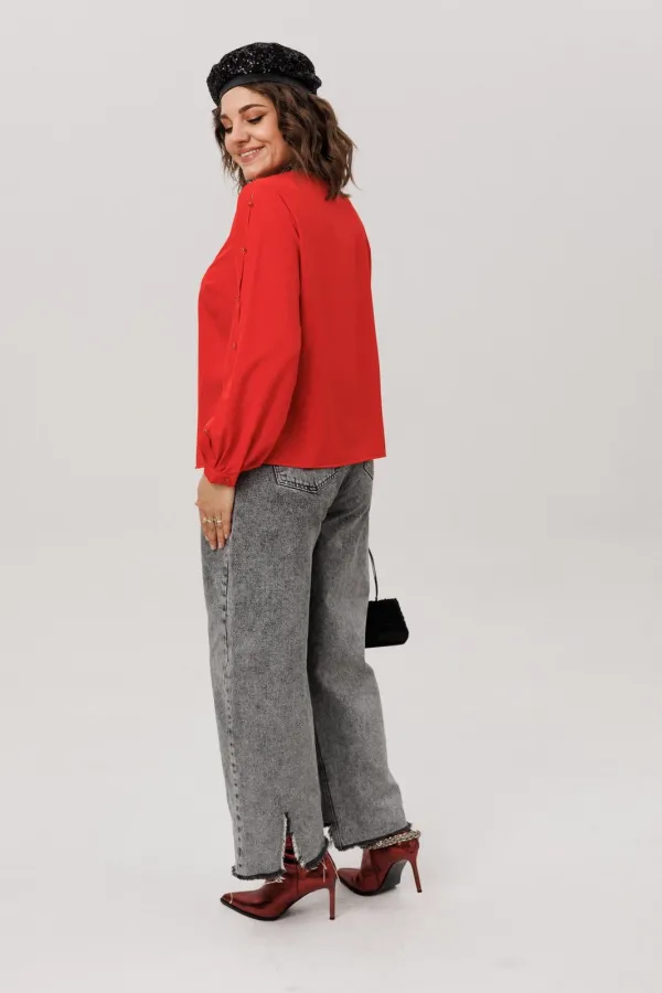 Мягкая ткань драпируется полуприлегающим силуэтом, ласково обрисовывая линии фигуры. Особое внимание притягивают рукава: втачные, с элегантными разрезами по всей длине, они завершаются манжетами на пуговицах, украшенными навесными петельками - деталь, придающая образу неповторимый шарм.