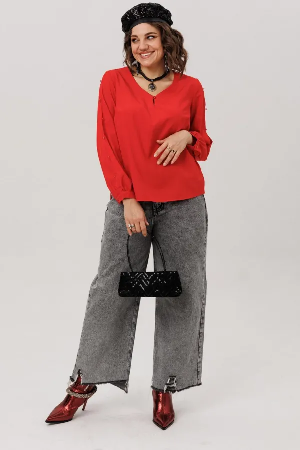 Глубокий V-образный вырез с застежкой позволяет варьировать степень открытости, делая блузу универсальной спутницей: она столь же органично смотрится с юбкой-карандашом на высоких каблуках, как и с парой классических джинсов.