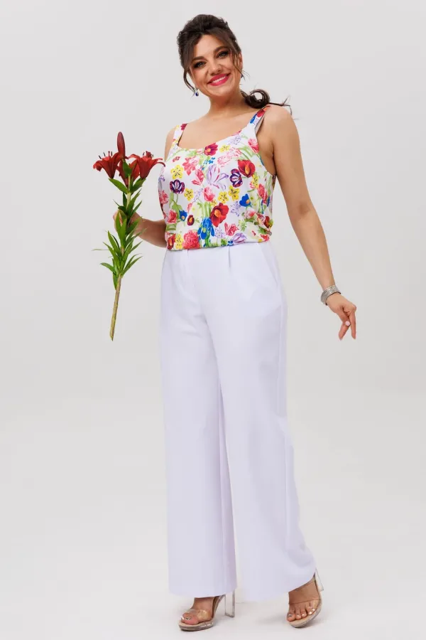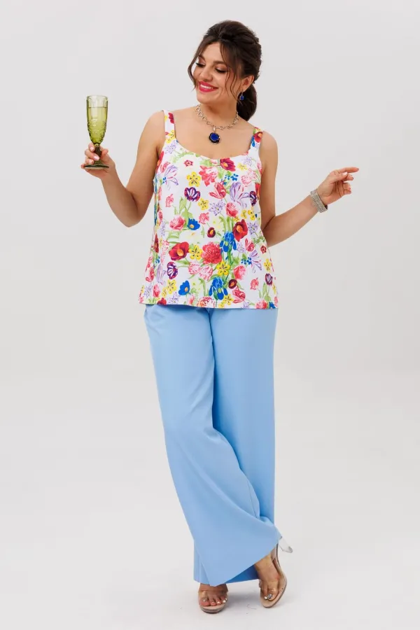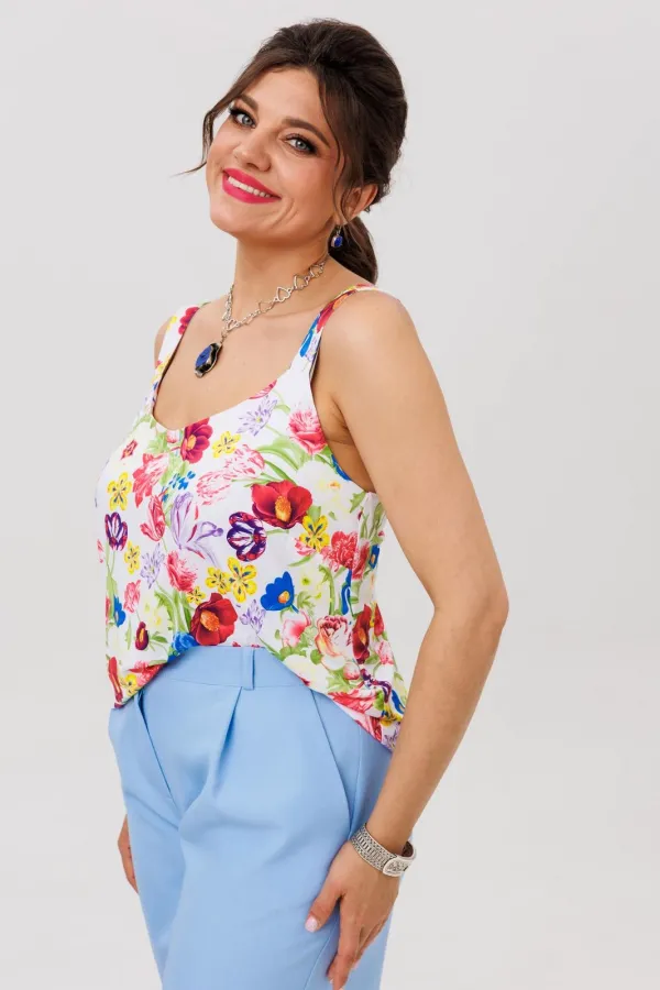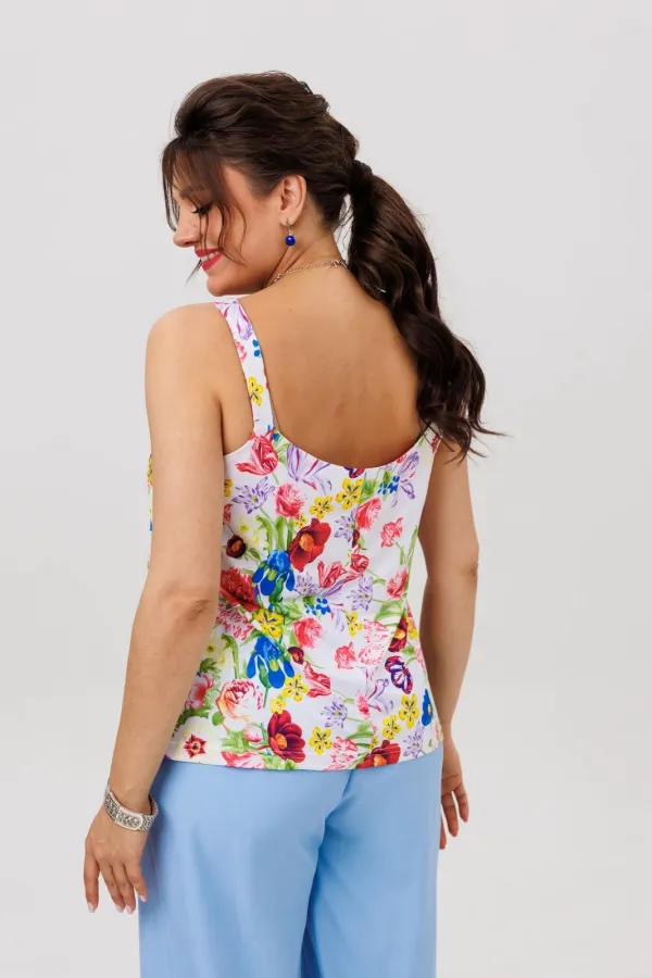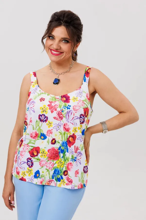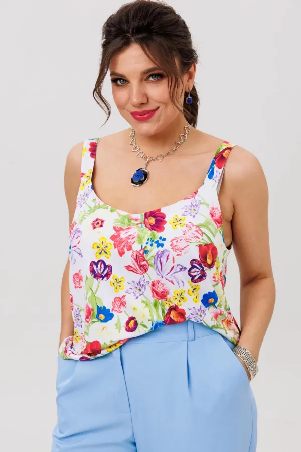 Топ в красочном цветочном принте «россыпь цветов» - лёгкий, нежный и наполненный настроением лета. Мягкая ткань с приятной фактурой деликатно струится, создавая ощущение лёгкости и естественной женственности. Яркий цветочный рисунок оживляет образ и добавляет ему свежести, делая топ выразительным, но при этом универсальным.