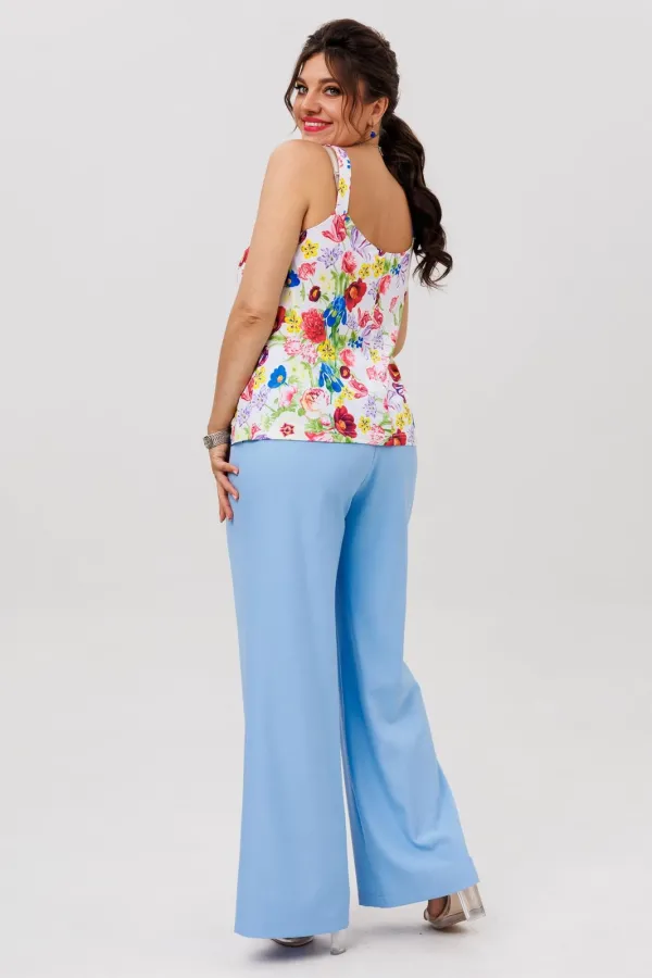 На модели голубые брюки 1702.1 и белые брюки 1416.1.Размер 54: ОГ-108; ОТ-110; ОБ-118; ДИ-39;