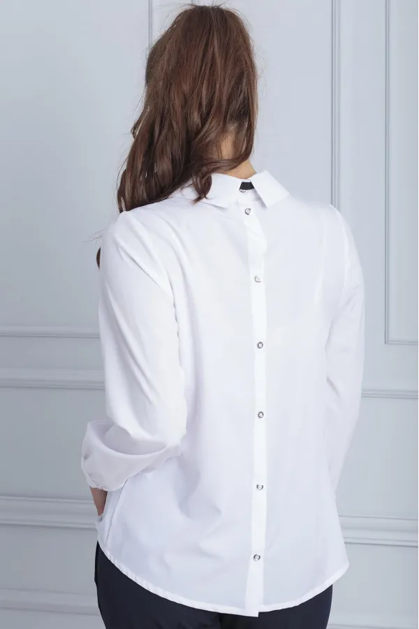 Блуза свободного кроя. скругленный воротник стойка, декорирован бантом. застежка на пуговицы по спинке платья. Декор продолжение пуговиц по спинке, имитация фальшь застежки.