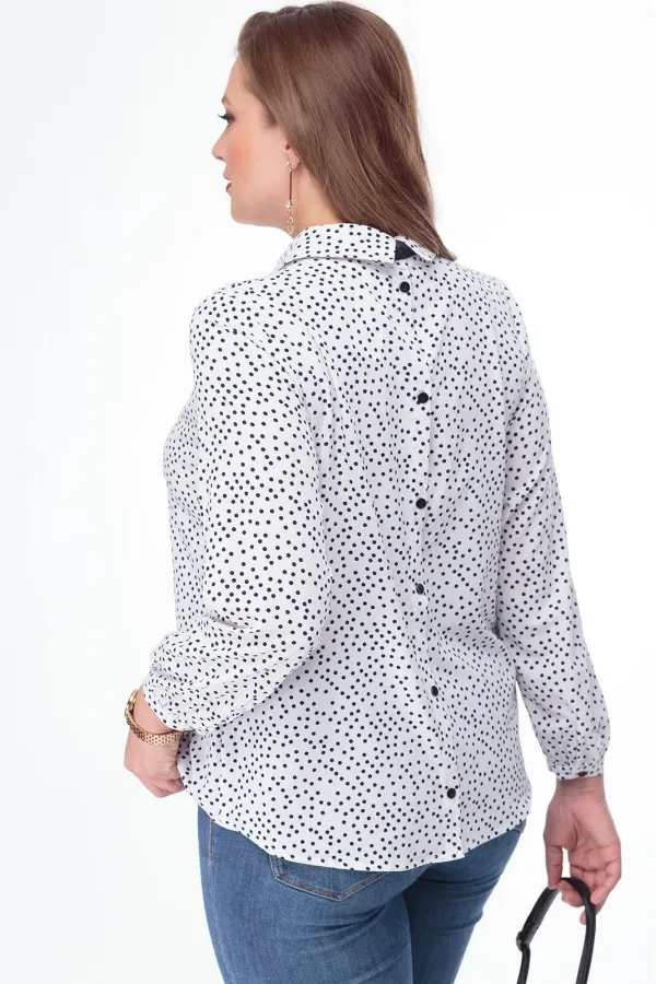 Блуза свободного кроя. скругленный воротник стойка, декорирован бантом. застежка на пуговицы по спинке платья. Декор продолжение пуговиц по спинке, имитация фальшь застежки.
