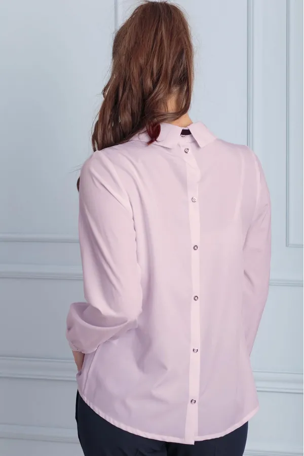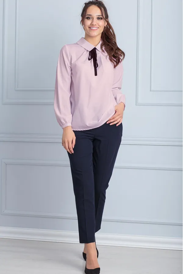 Блуза свободного кроя. скругленный воротник стойка, декорирован бантом. застежка на пуговицы по спинке платья. Декор продолжение пуговиц по спинке, имитация фальшь застежки.