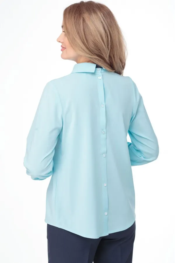 Блуза свободного кроя. скругленный воротник стойка, декорирован бантом. застежка на пуговицы по спинке платья. Декор продолжение пуговиц по спинке, имитация фальшь застежки.