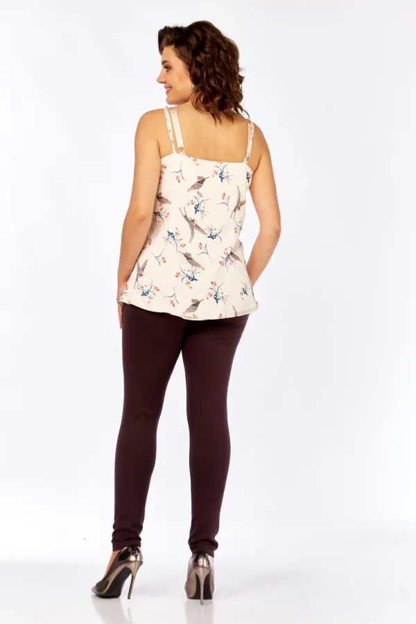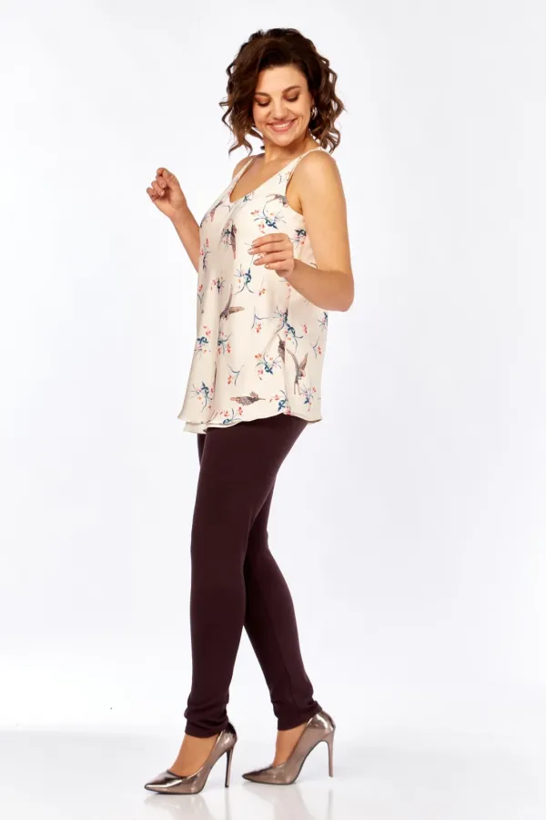 Топ на бретелях полуприлегающего силуэта. Топ двойной верх выполнен из ткани с дизайном, низ однотон. Перед покроен по косой. Бретели регулируются. Длина по боковому-45см.Параметры модели: обхват груди-98см, обхват бедер-110см, размер топа на модели 50.
