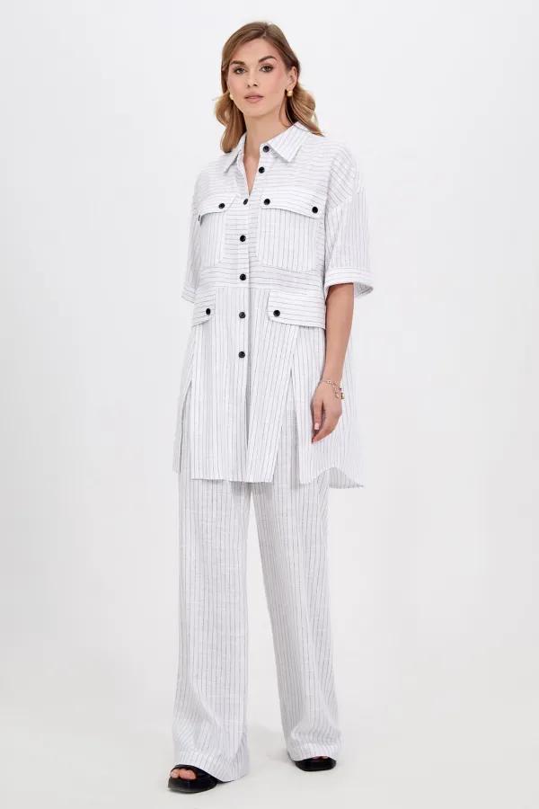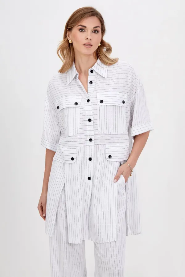 Эта рубашка свободного кроя с интересной игрой полоски создаст образу особое настроение. Модель с классическим отложным воротником дополнена застёжкой на пуговицы, накладными карманами, отделочными клапанами и разрезами. Чтобы соответствовать спущенной линии плеча, рукава укорочены и широки. Особое внимание заслуживает интересное решение спинки, создающий воздушный летящий образ. Мягкий смесовый материал на основе льна с добавлением вискозы приятен при носке. В пару к рубашке можно подобрать брюки из той же линейки.