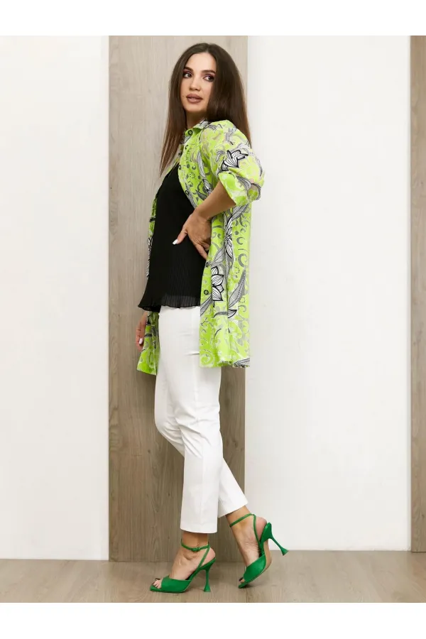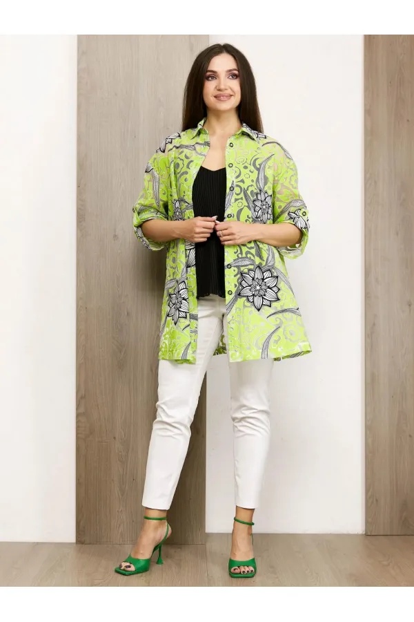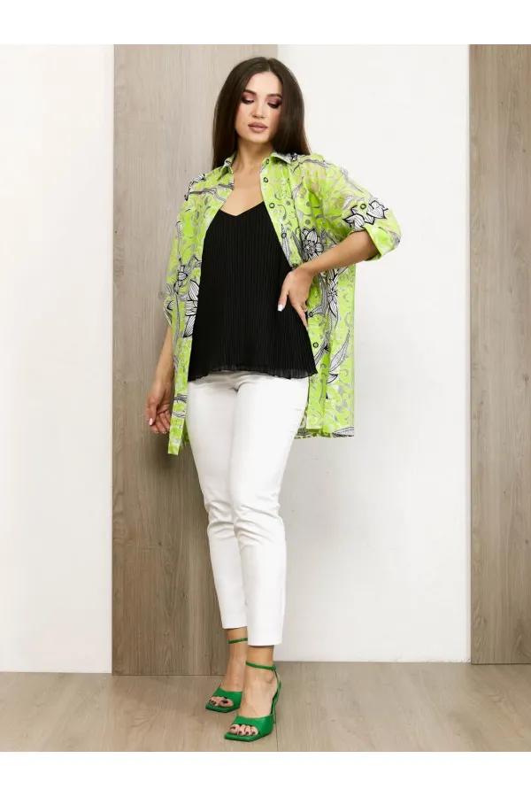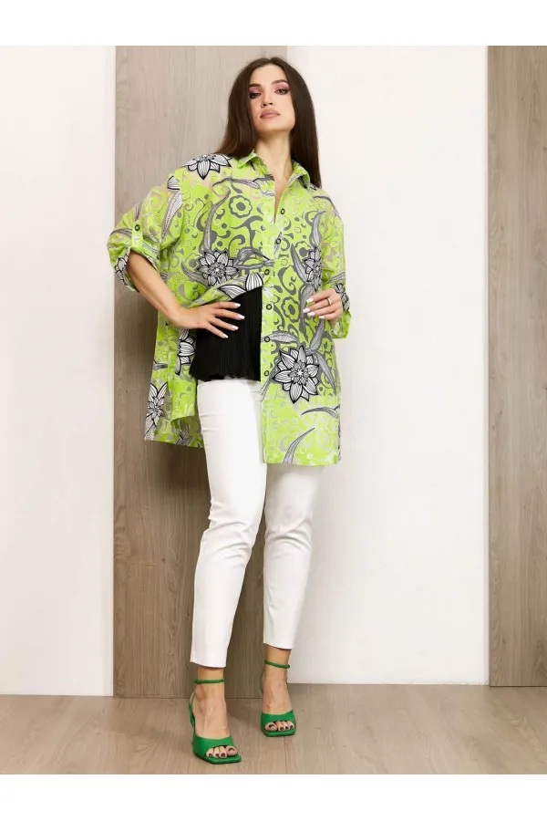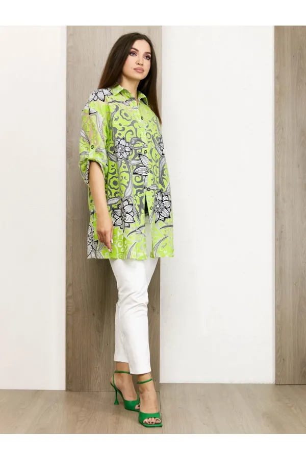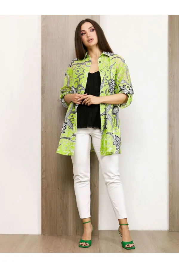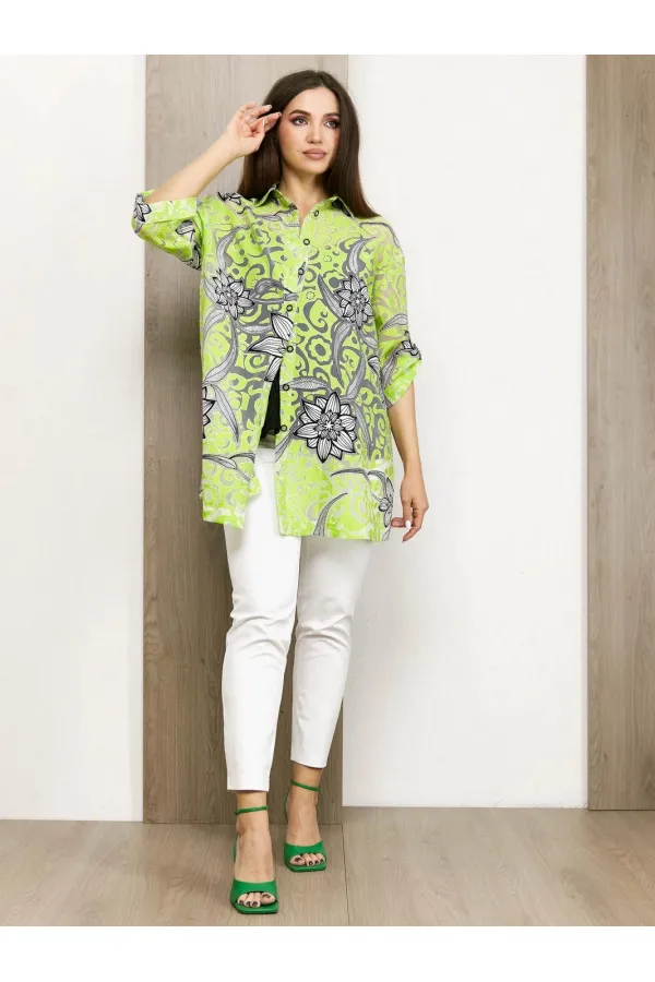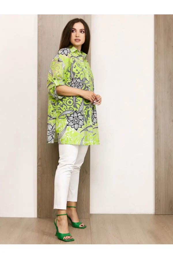 Нарядная блузка с разрезами по бокам. Блузка прямого силуэта на пуговицах. Рукав ¾. Длина рукава регулируется патой. Имеется отложной воротник на стойке. Можно комбинировать и экспериментировать с различными образами. Эта великолепная блузка станет неотъемлемой часть Вашего гардероба. Добавьте топ, юбку, брюки, модные аксессуары, и вы будете неотразимы. Внимание: топ в комплект не входит.