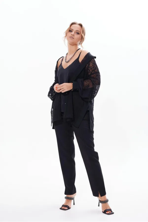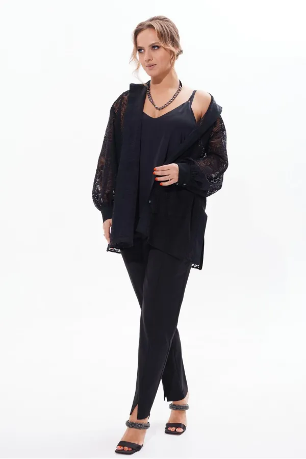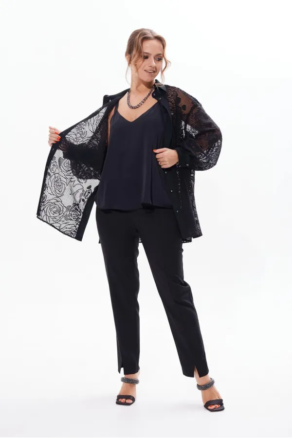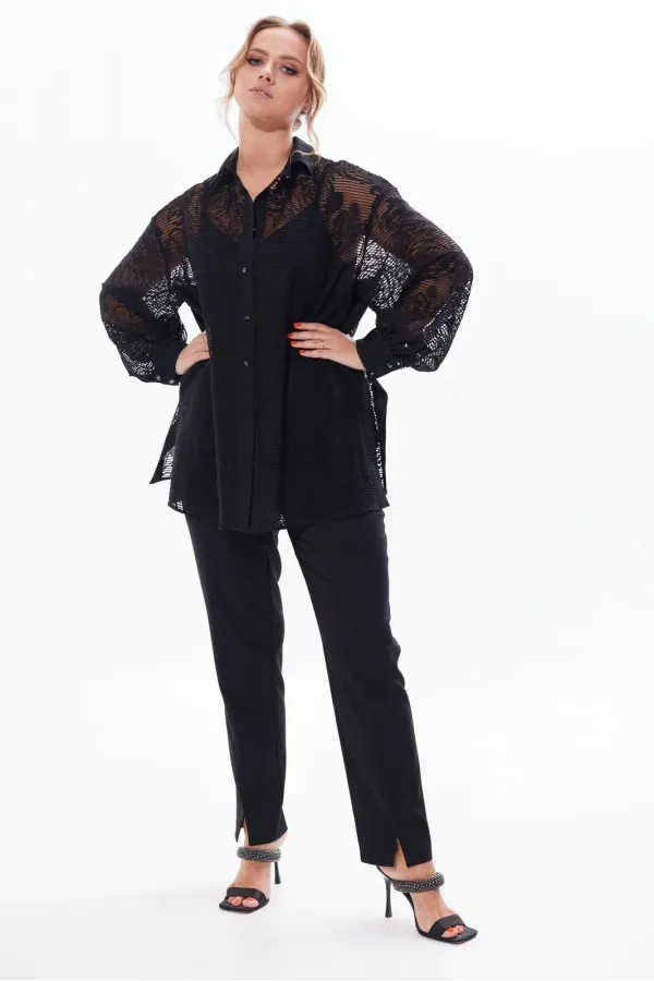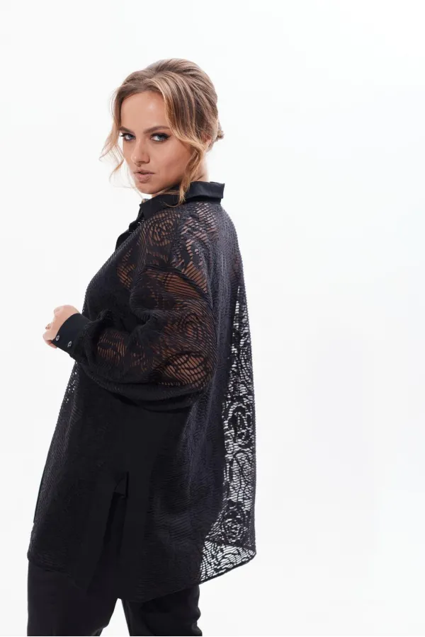 Нарядная кружевная блузка с разрезами по бокам. Блузка прямого силуэта с планкой на пуговицах с длинным рукавом с манжетой. Имеется отложной воротник на стойке. Можно комбинировать и экспериментировать с различными образами. Эта великолепная блузка станет неотъемлемой часть Вашего гардероба. Добавьте топ, юбку, брюки, модные аксессуары, и вы будете неотразимы. В комплект входит только верхняя блузка-рубашка. Без топа.