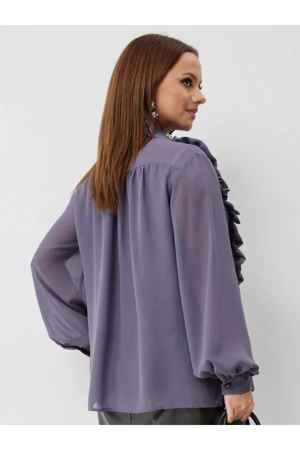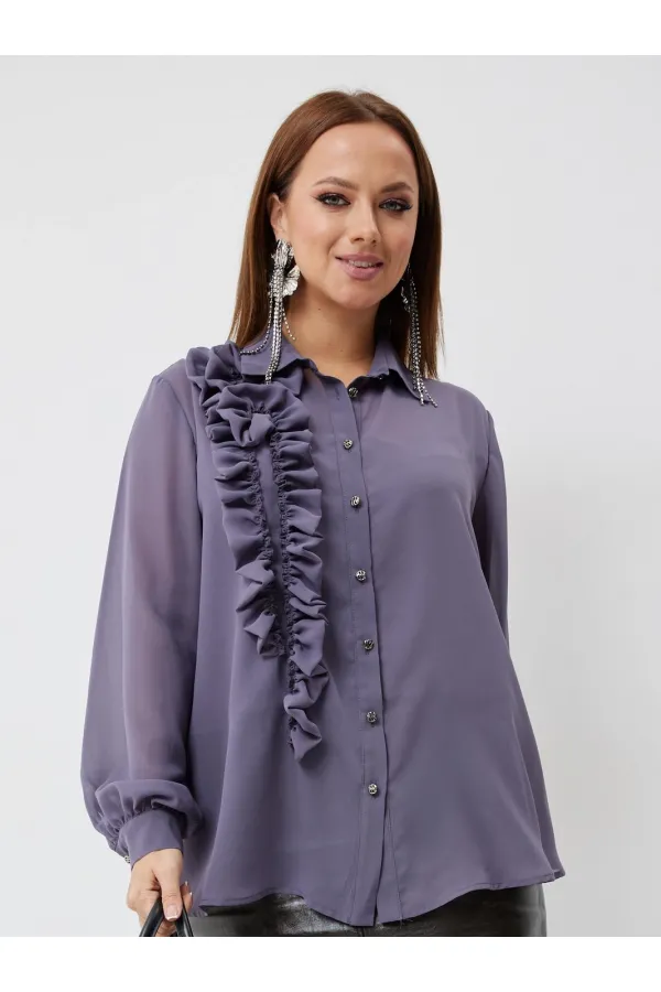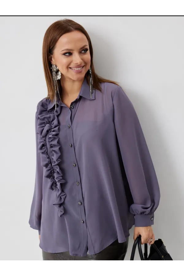 Эта изысканная блузка выполнена из нежного шифона и имеет прямой силуэт, который выгодно подчеркнет вашу женственность, блузка на подкладке. Она застегивается спереди на элегантные петли-пуговицы, что придает ей особый шарм. Блузка также украшена декоративными воланами на правой полочке, переходящими в красивый цветок, делая ее нарядной.