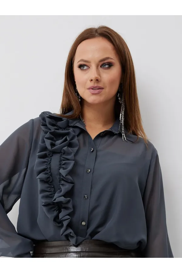 Эта изысканная блузка выполнена из нежного шифона и имеет прямой силуэт, который выгодно подчеркнет вашу женственность, блузка на подкладке. Она застегивается спереди на элегантные петли-пуговицы, что придает ей особый шарм. Блузка также украшена декоративными воланами на правой полочке, переходящими в красивый цветок, делая ее нарядной.