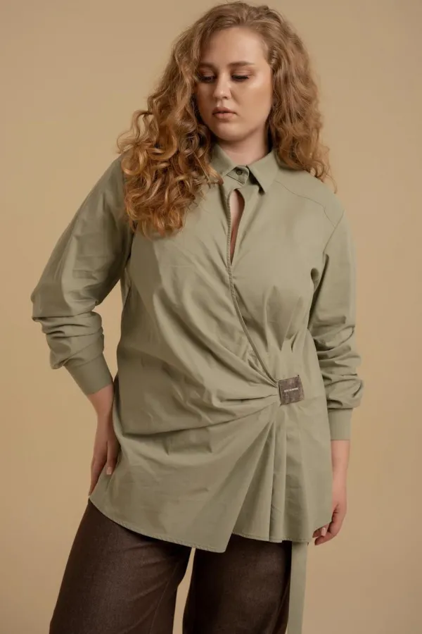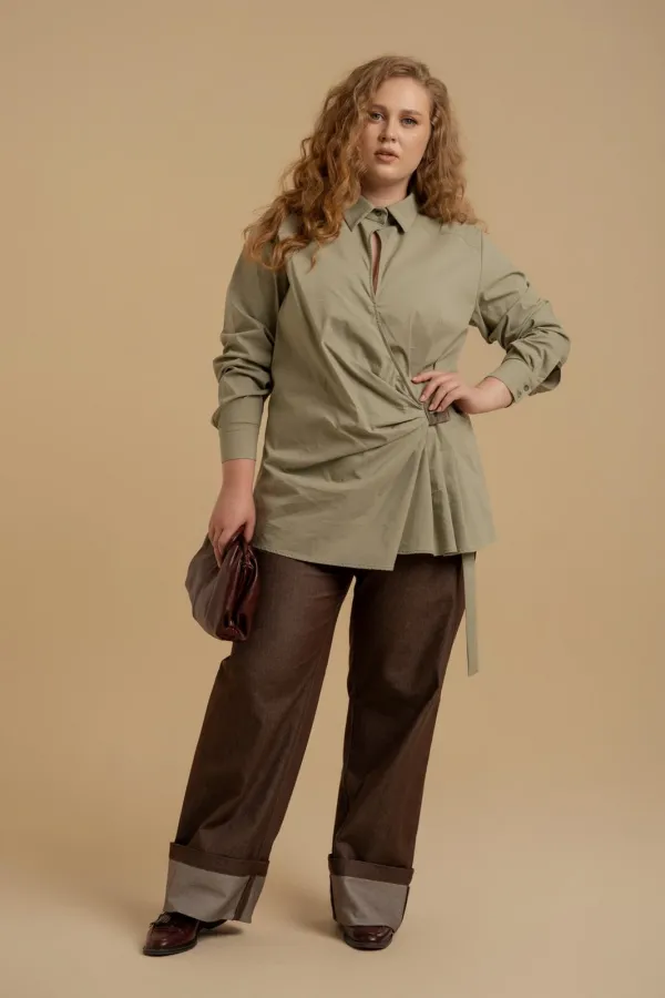 Блузка женская свободного силуэта из хлопковой ткани. Вырез горловины оформлен воротником рубашечного типа. Рукава - втачные с манжетами. На передних половинках - кокетки. Застежка выполнена в виде запаха с драпировками ... Читать далее...