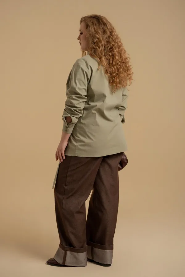 Блузка женская свободного силуэта из хлопковой ткани. Вырез горловины оформлен воротником рубашечного типа. Рукава - втачные с манжетами. На передних половинках - кокетки. Застежка выполнена в виде запаха с драпировками в области талии. Декорировано пришивной аппликацией.
