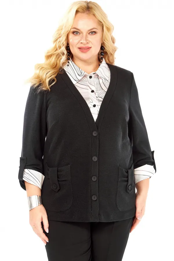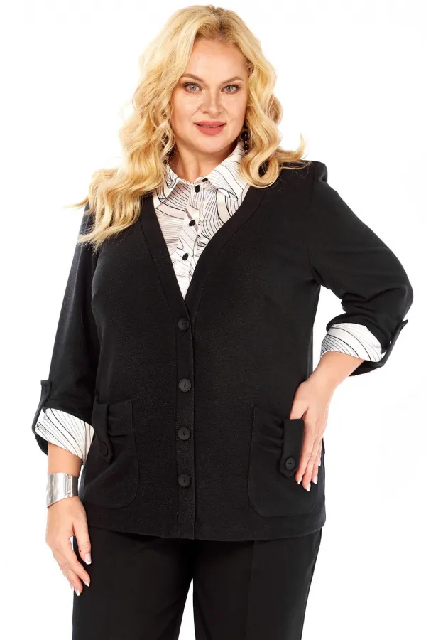 Имитация рубашки под джемпером - это отличный вариант практичной и удобной одежды. Джемпер прямого силуэта, комбинированный, выполнен из мягкого трикотажа и блузочной ткани. Полочка с нагрудными вытачками, накладными фиг... Читать далее...