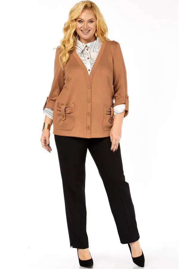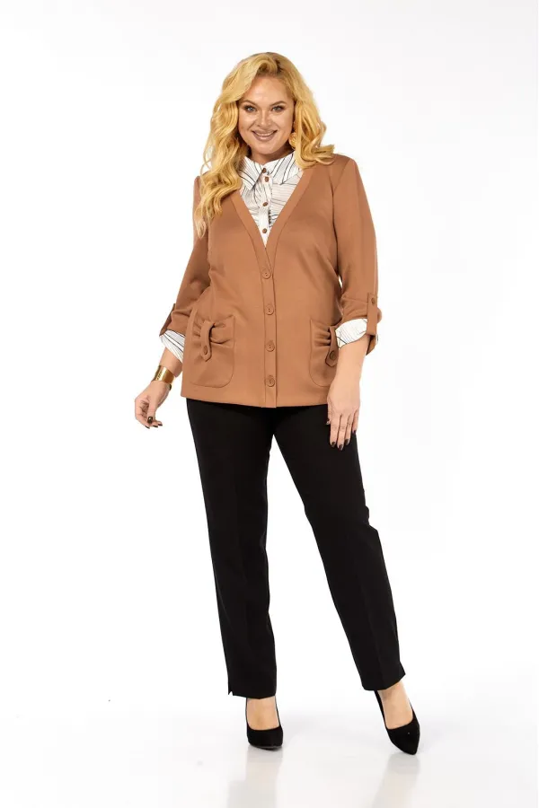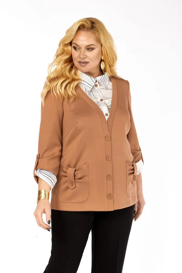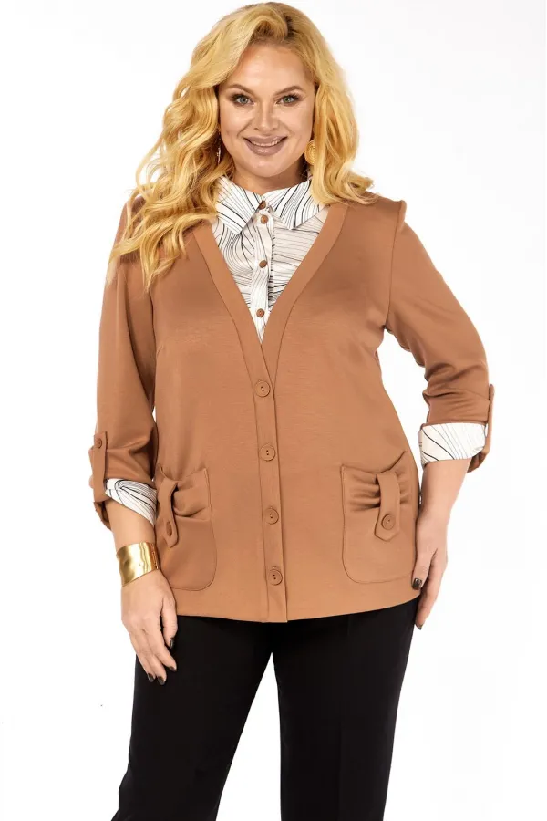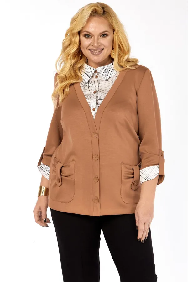 Имитация рубашки под джемпером - это отличный вариант практичной и удобной одежды. Джемпер прямого силуэта, комбинированный, выполнен из мягкого трикотажа и блузочной ткани. Полочка с нагрудными вытачками, накладными фиг... Читать далее...