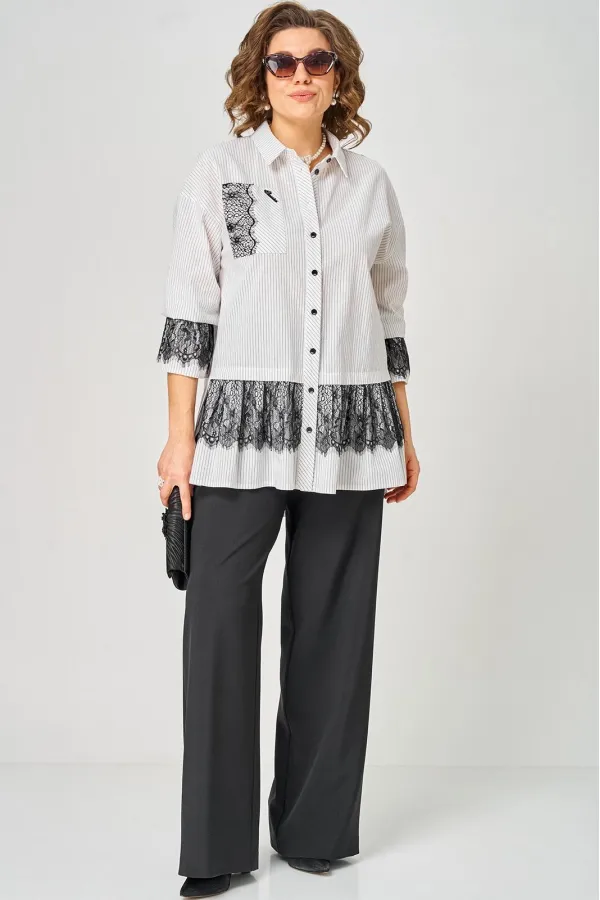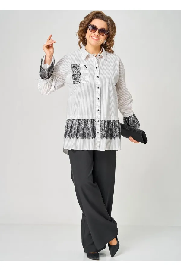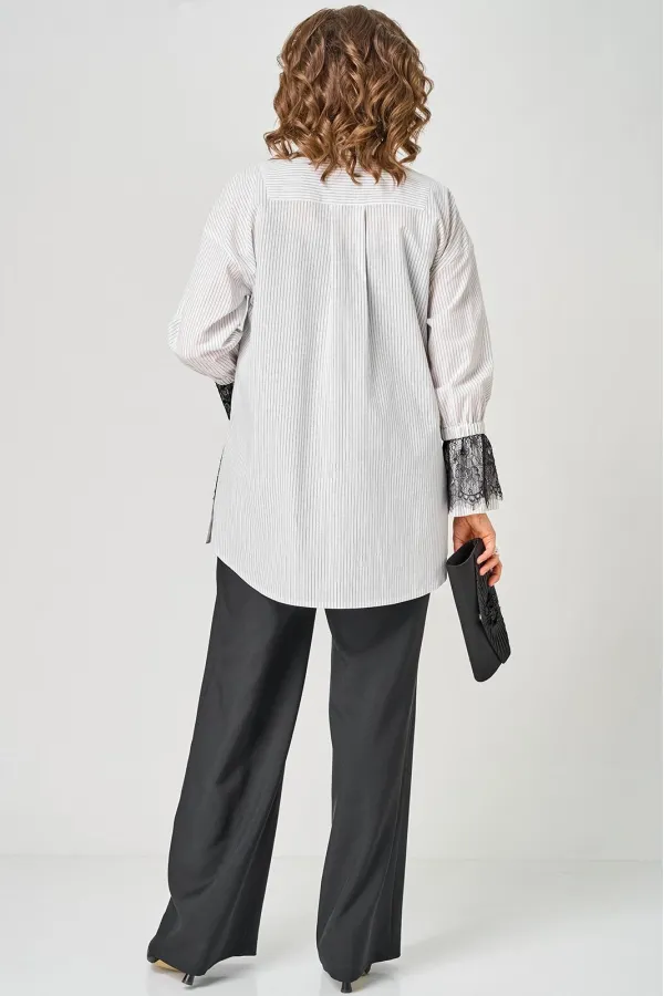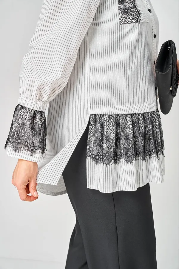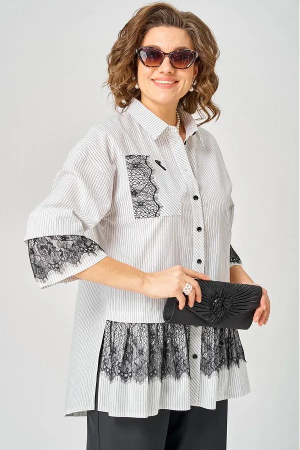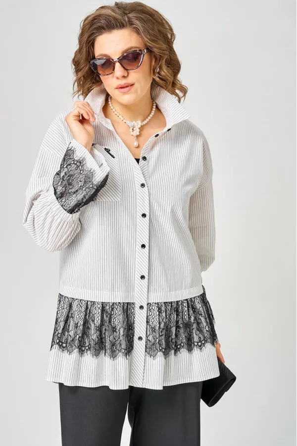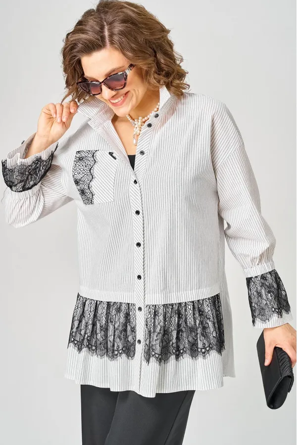 Блузка женская нарядно повседневного элегантного стиля, прямого силуэта с фигурным низом выполнена из шикарного дышащего хлопка в полоску в сочетании с красивым дорогим кружевом. Вырез горловины воротник на стойке рубашечного типа, застежка доверху на обметанные петли и пуговицы. Рукав спущенный, втачной по низу на притачной манжете, в боковых швах обработаны разрезы. На полочке функциональный накладной карман с отделкой из красивого кружева, изящная металлическая бренд лейбл и контрасные пуговицы придают изделию стильный и современный дизайн. Подрез с декоративным кружевом делает изделие трендом сезона. По спинке фигурная кокетка и встречная складка, создают идеальную посадку. Универсальный силуэт, элегантный крой, стильный дизайн - все детали только подчеркивают достоинства фигуры, а декор из кружева создает трендовый образ.