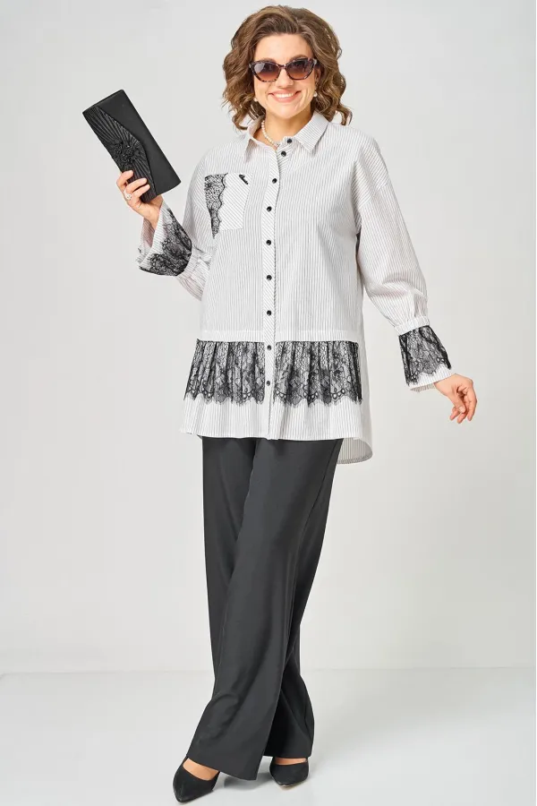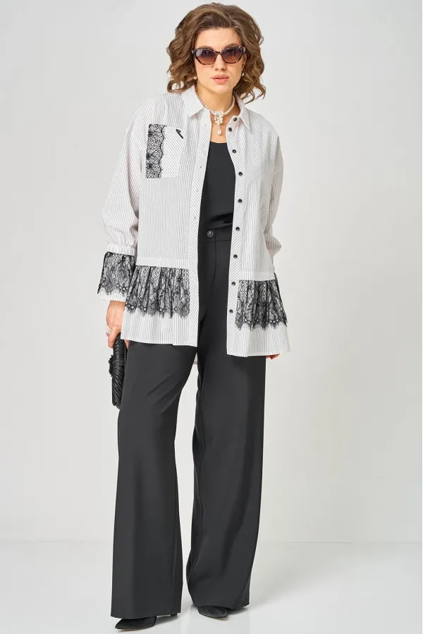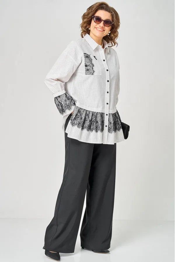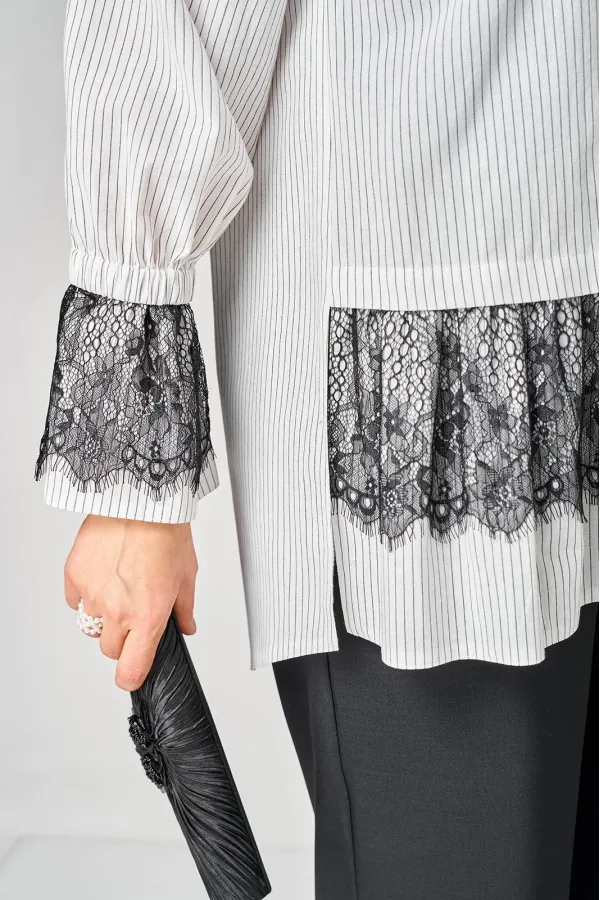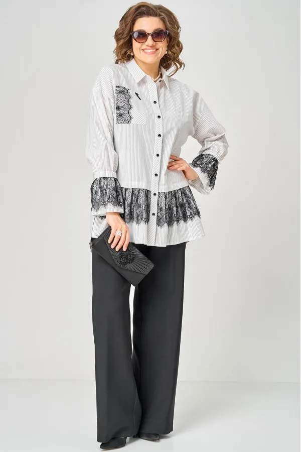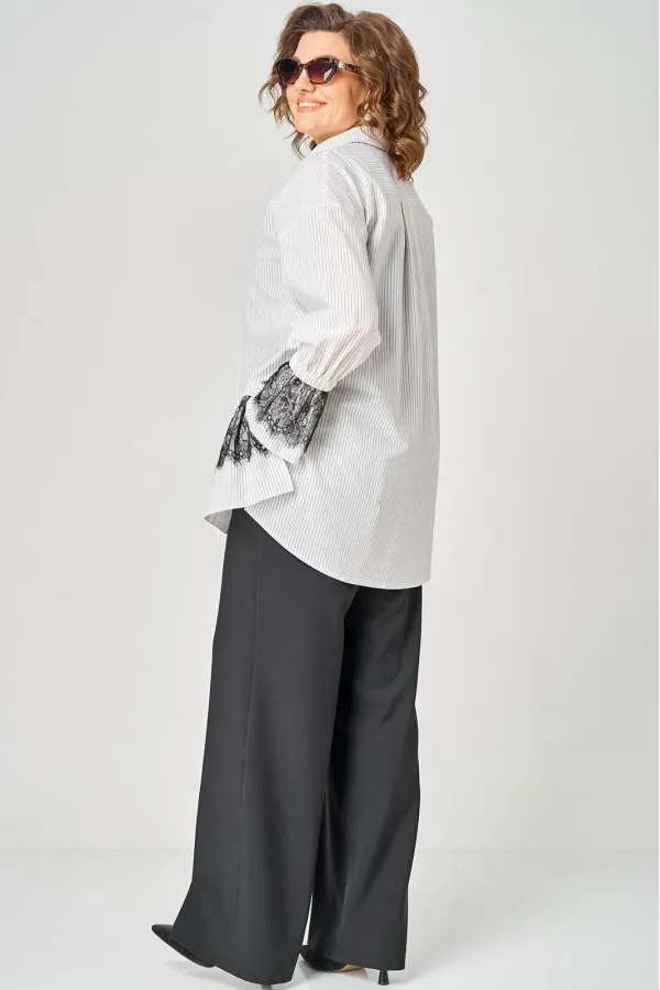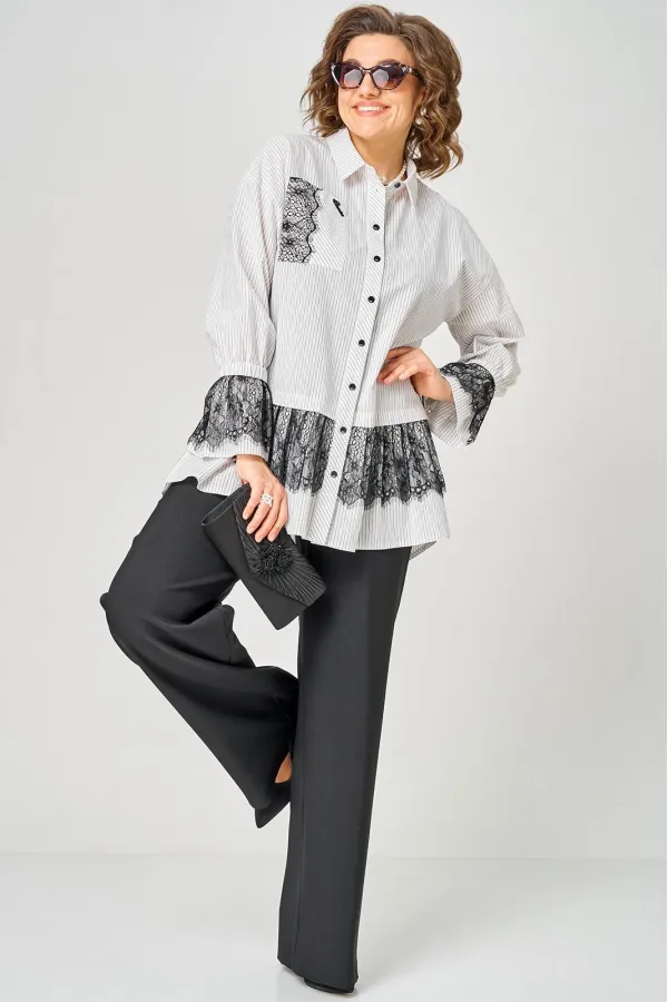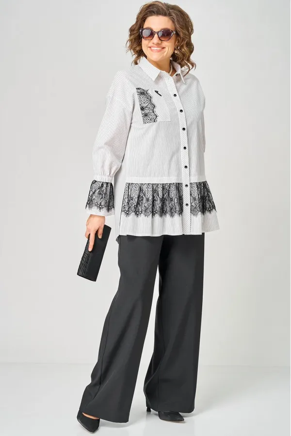 Блузка женская нарядно повседневного элегантного стиля, прямого силуэта с фигурным низом выполнена из шикарного дышащего хлопка в полоску в сочетании с красивым дорогим кружевом. Вырез горловины воротник на стойке рубашечного типа, застежка доверху на обметанные петли и пуговицы. Рукав спущенный, втачной по низу на притачной манжете, в боковых швах обработаны разрезы. На полочке функциональный накладной карман с отделкой из красивого кружева, изящная металлическая бренд лейбл и контрасные пуговицы придают изделию стильный и современный дизайн. Подрез с декоративным кружевом делает изделие трендом сезона. По спинке фигурная кокетка и встречная складка, создают идеальную посадку. Универсальный силуэт, элегантный крой, стильный дизайн - все детали только подчеркивают достоинства фигуры, а декор из кружева создает трендовый образ.