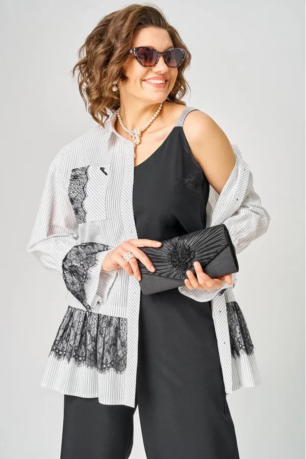 Блузка женская нарядно повседневного элегантного стиля, прямого силуэта с фигурным низом выполнена из шикарного дышащего хлопка в полоску в сочетании с красивым дорогим кружевом. Вырез горловины воротник на стойке рубаше... Читать далее...