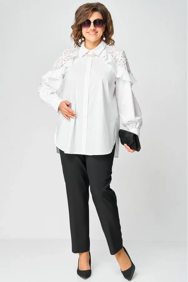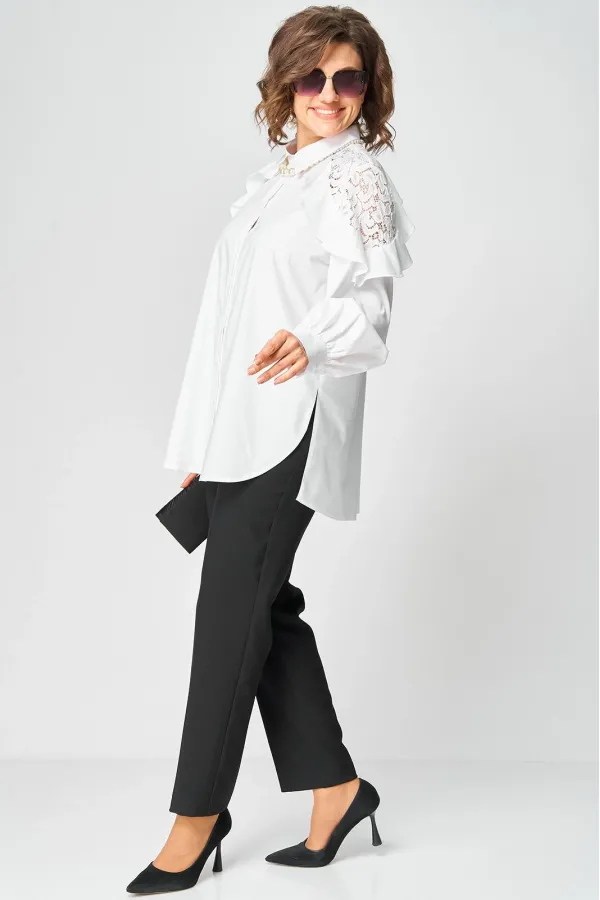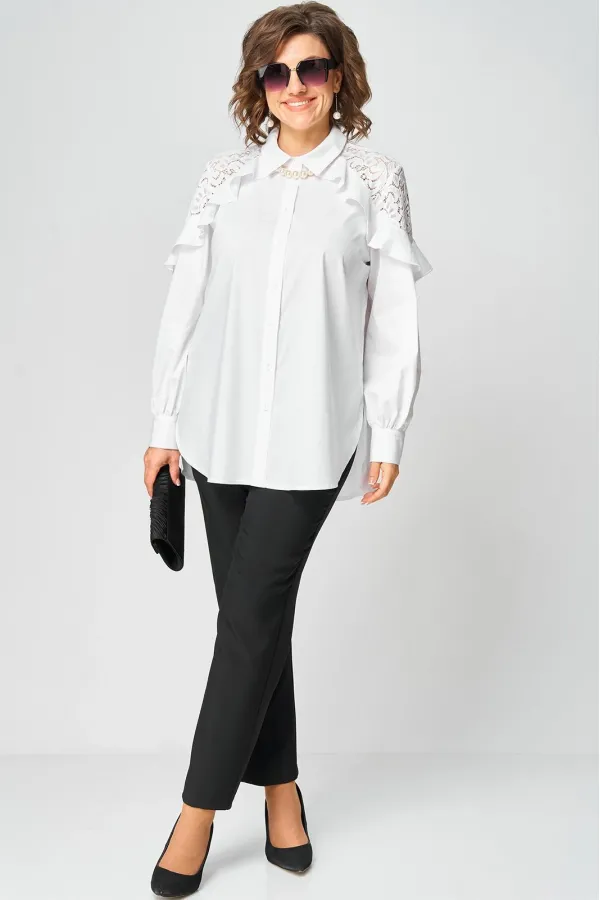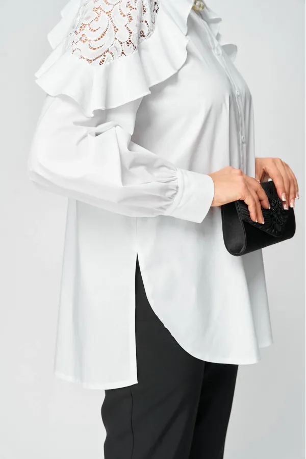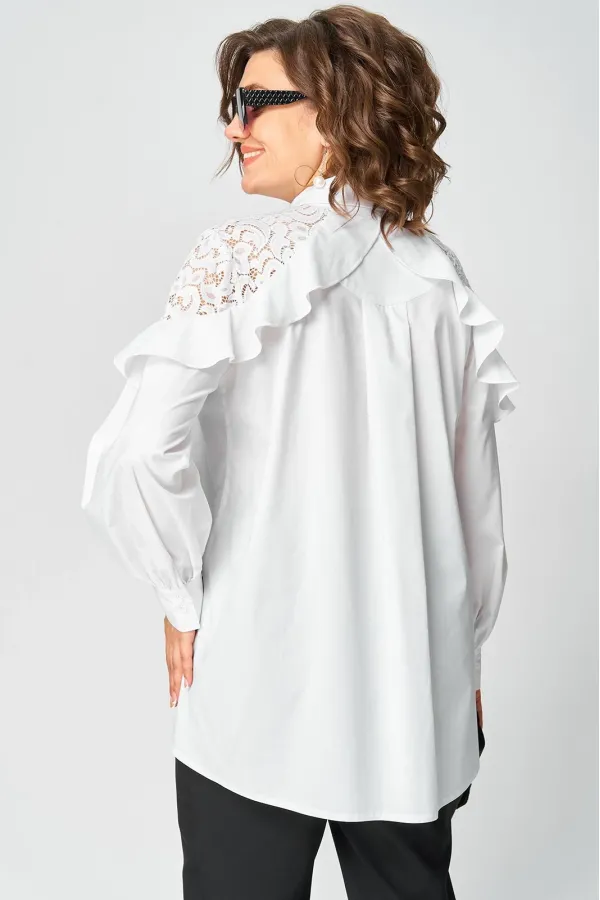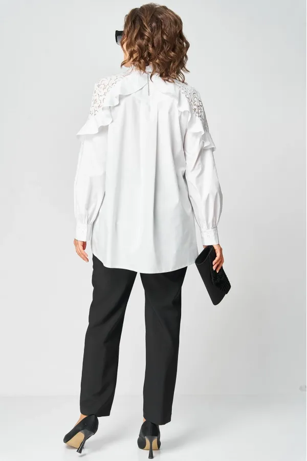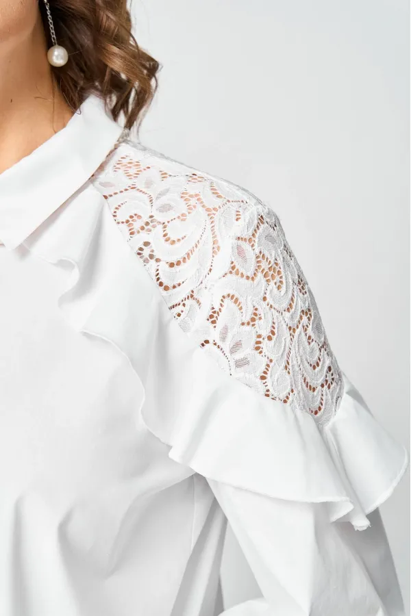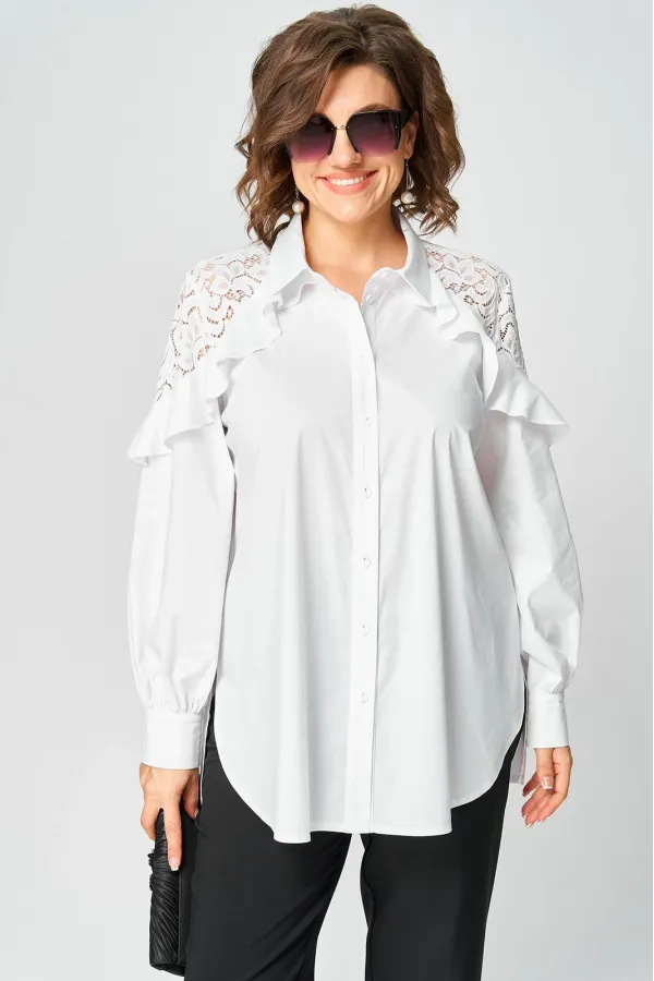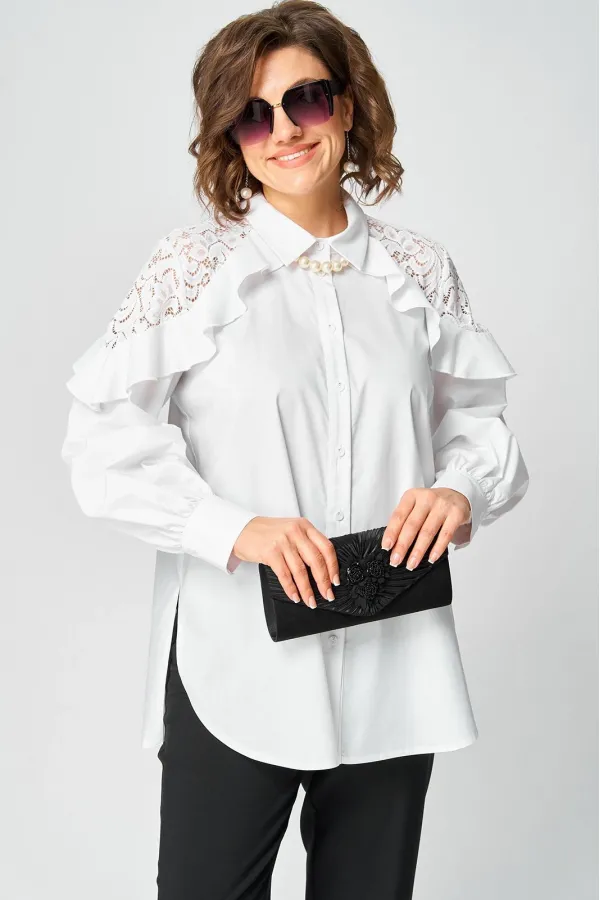 Блузка женская шикарная красивая нарядно-повседневная свободного силуэта выполнена их хлопка в сочетании с элегантным кружевом. Вырез горловины воротник на стойке рубашечного типа, рукав втачной с декоративным подрезом из кружева по низу на притачной манжете. Застежка до верху на обметанные петли и пуговицы. Низ блузы фигурный, в боковых швах обработан разрезы.