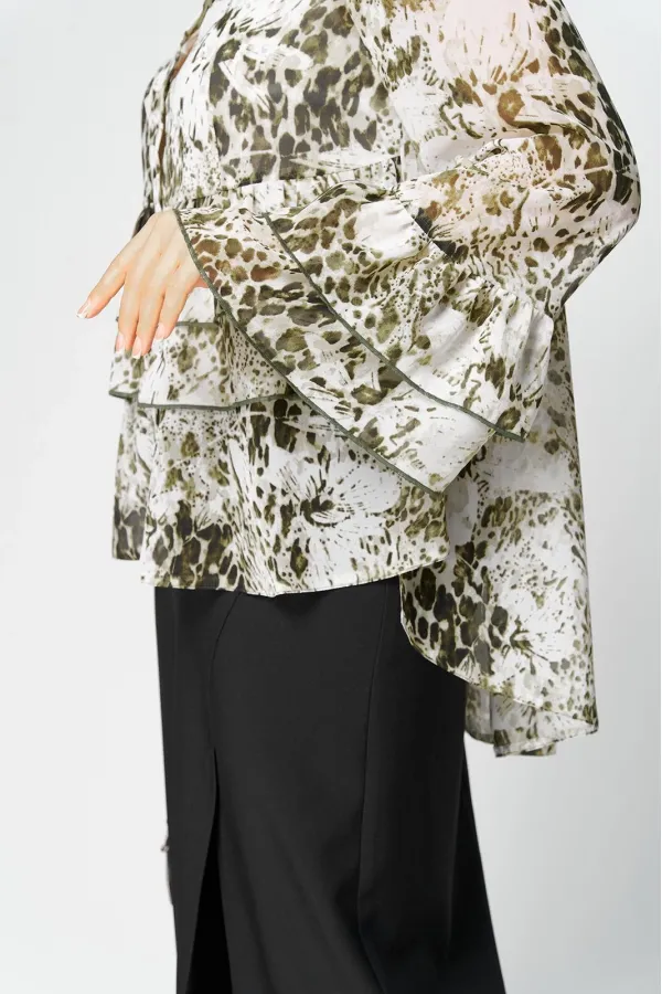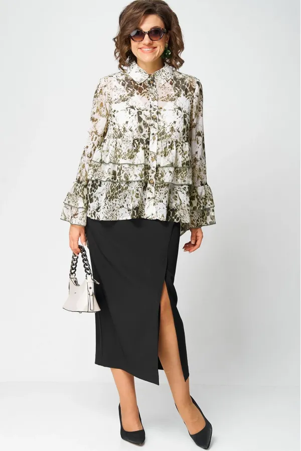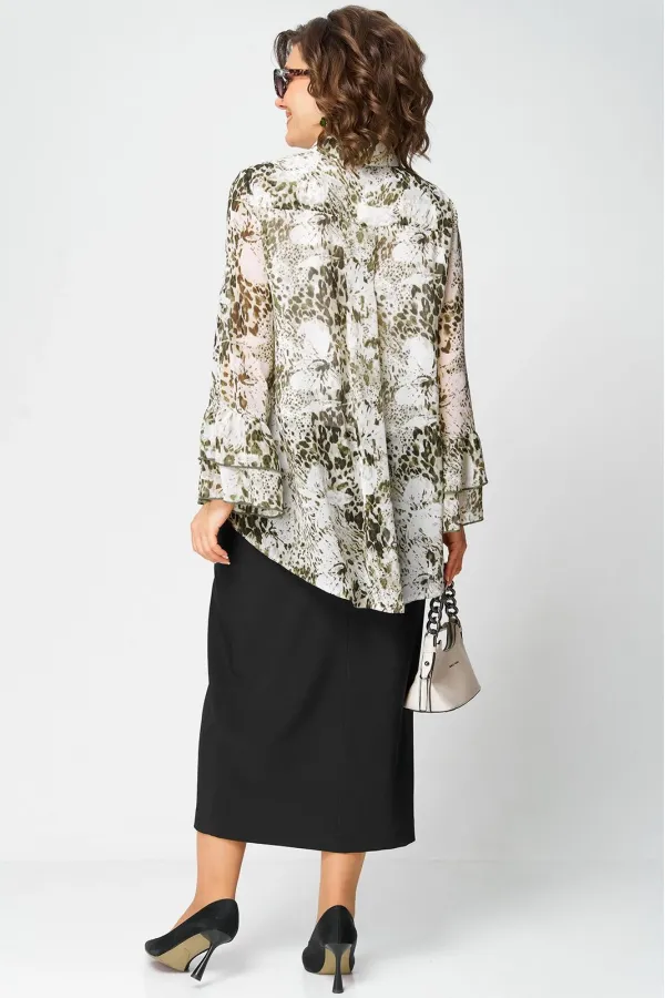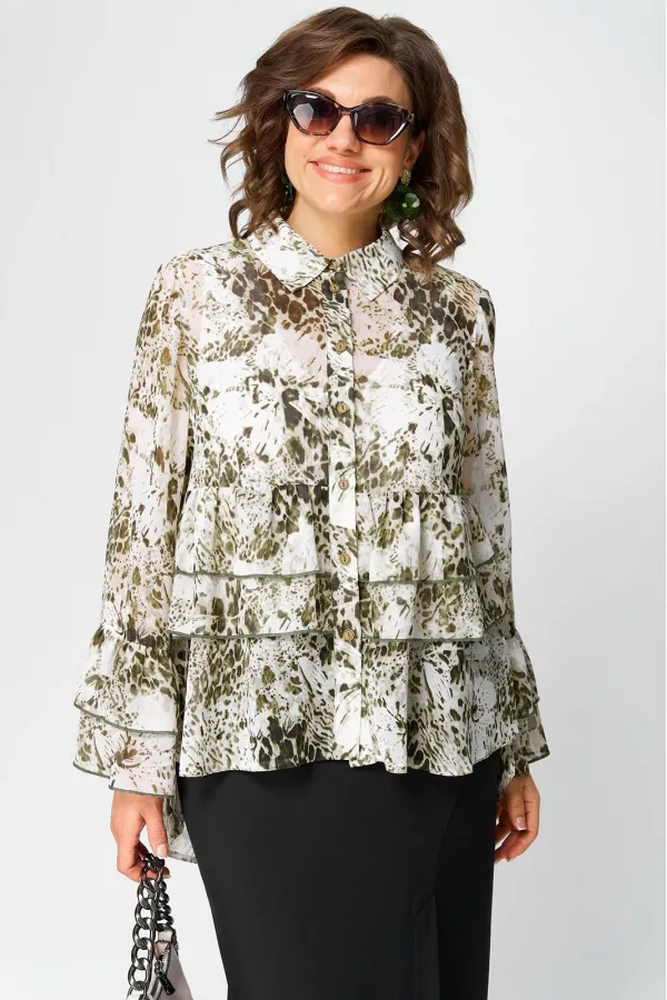 Блуза женская шикарная нарядно - повседневная полуприлегающего силуэта на подкладке, выполнена из красивого шифона с принтом. Вырез горловины воротник на стойке рубашечного типа, рукав втачной по низу с притачными воланами. Застежка доверху на обметанные петли и пуговицы, низ блузы фигурный (по спинке длиннее). По переду блузы притачные воланы, в боковых швах обработаны разрезы. Декором блузы служит принт самой ткани и отделочные элементы в виде воланов.