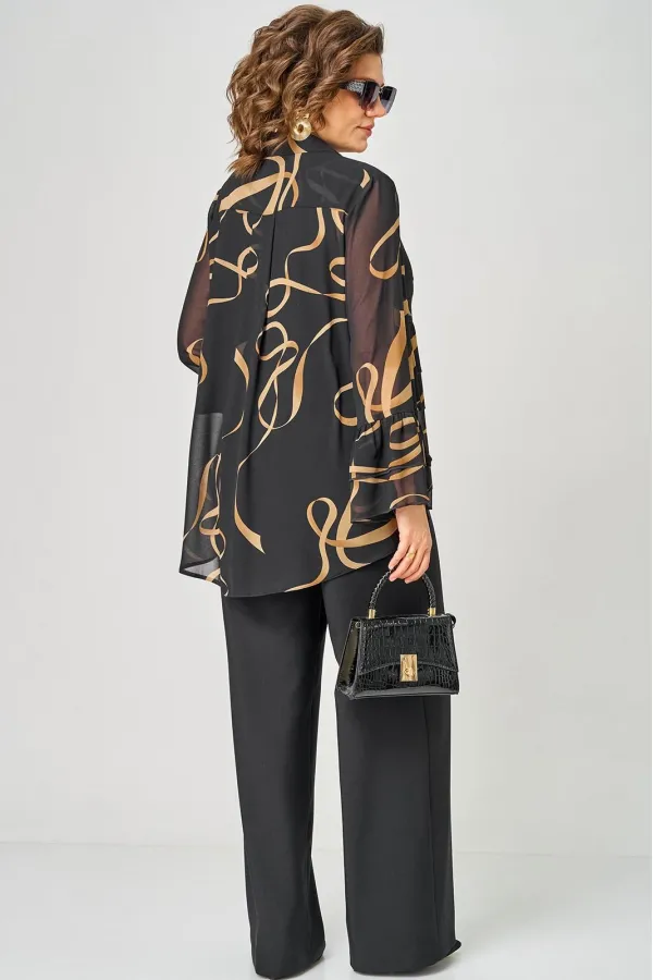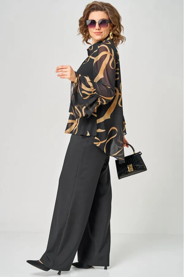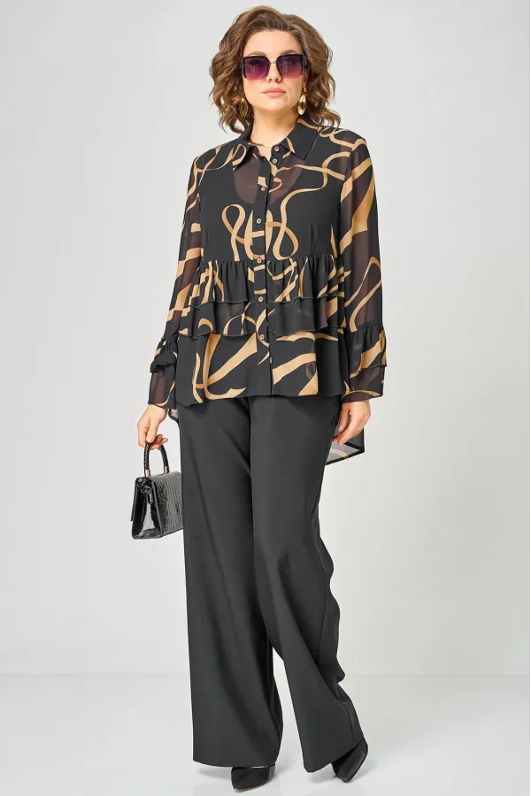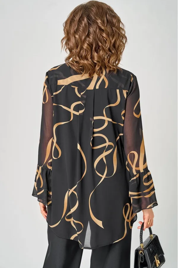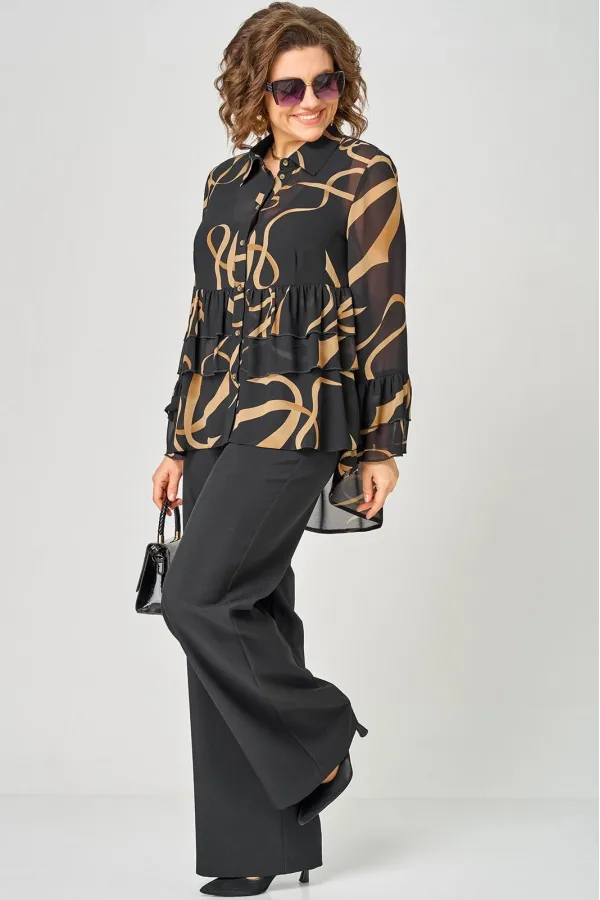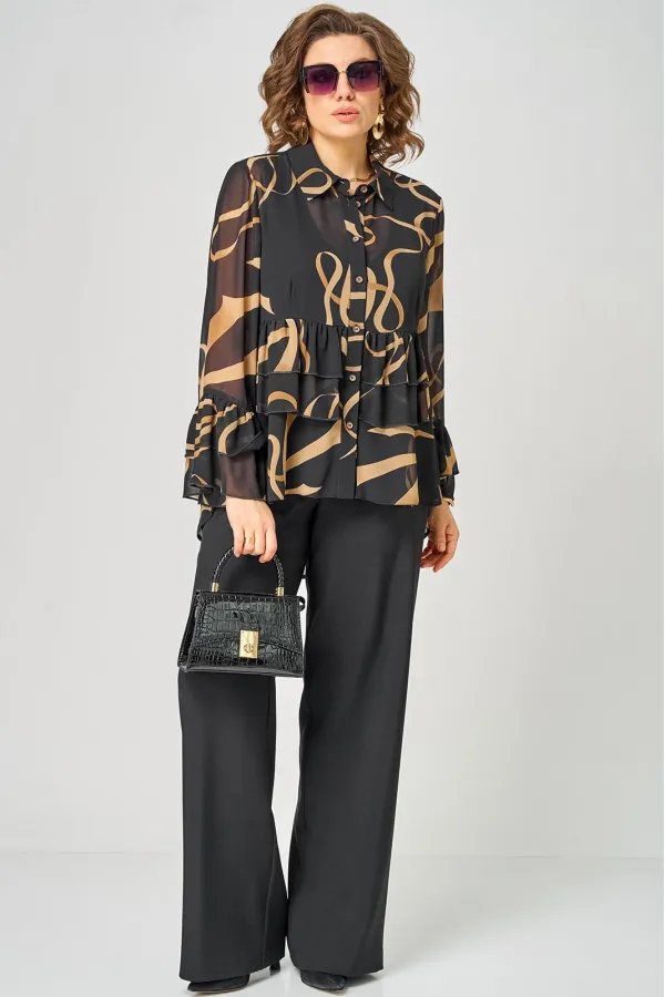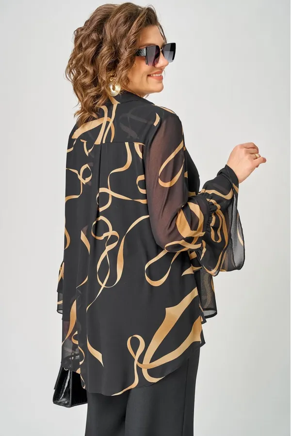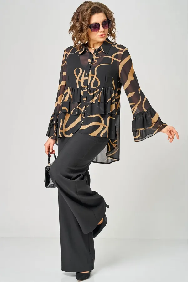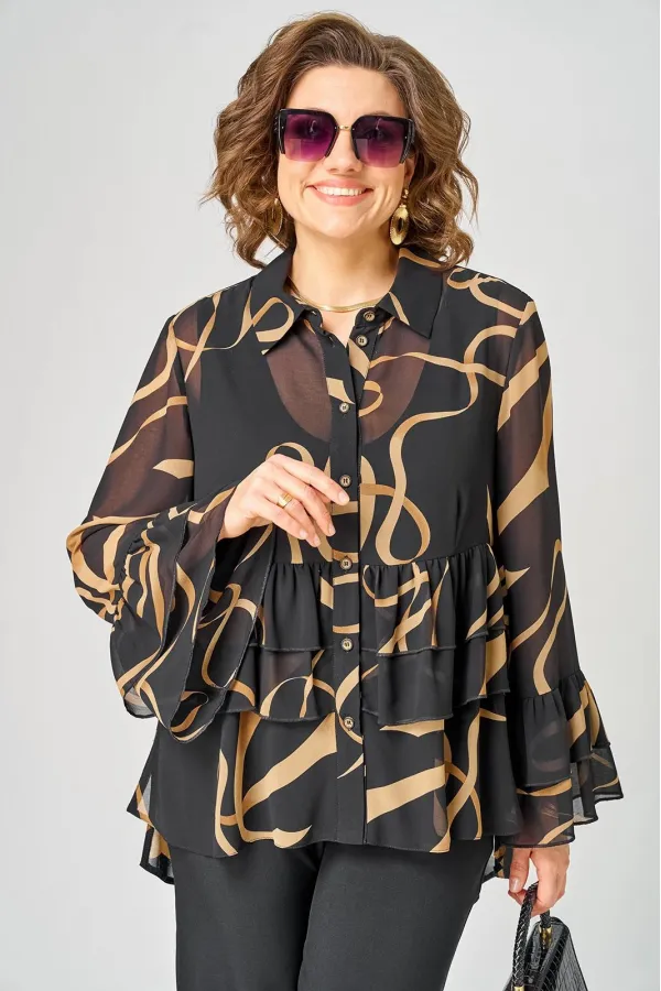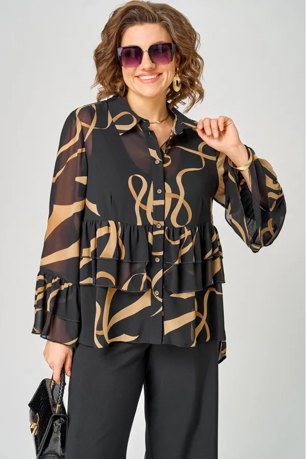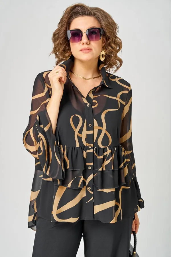 Блуза женская шикарная нарядно - повседневная полуприлегающего силуэта на подкладке, выполнена из красивого шифона с принтом. Вырез горловины воротник на стойке рубашечного типа, рукав втачной по низу с притачными воланами. Застежка доверху на обметанные петли и пуговицы, низ блузы фигурный (по спинке длиннее). По переду блузы притачные воланы, в боковых швах обработаны разрезы. Декором блузы служит принт самой ткани и отделочные элементы в виде воланов.