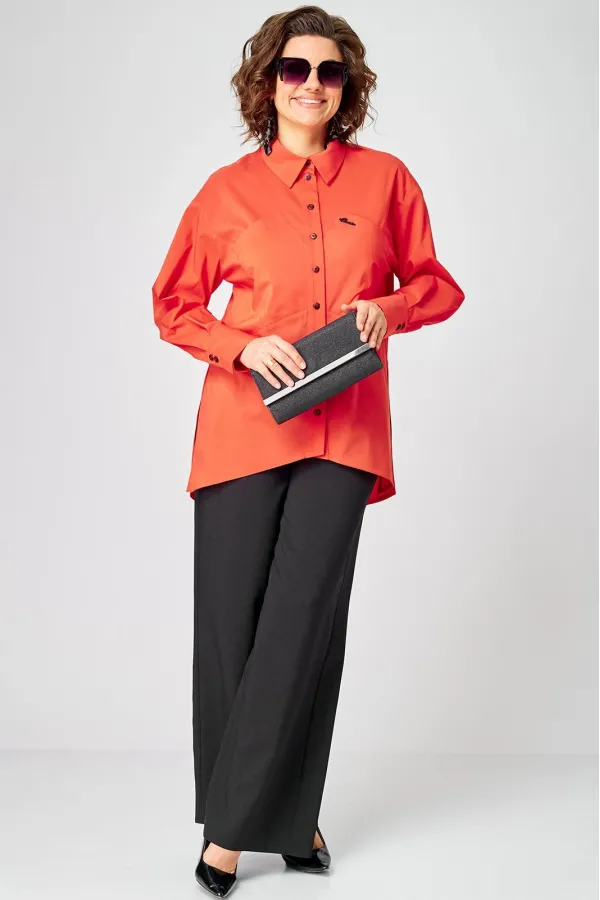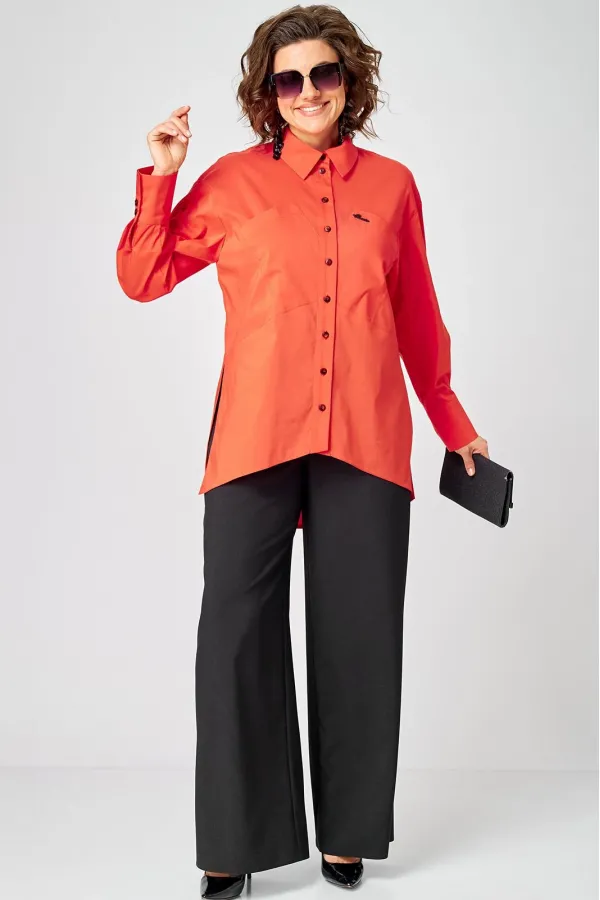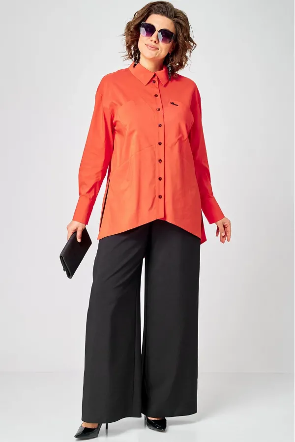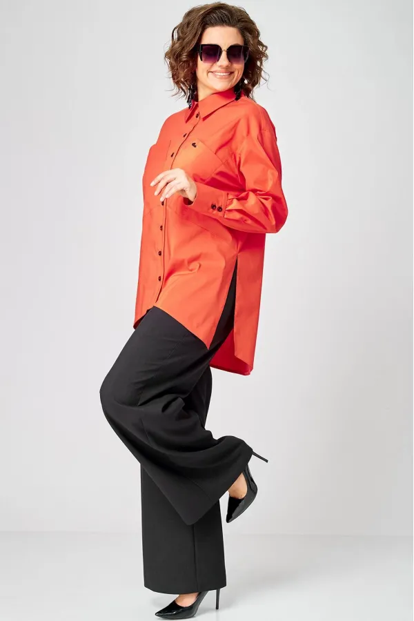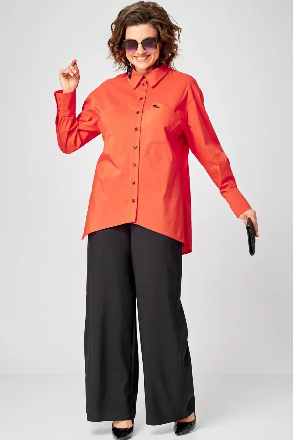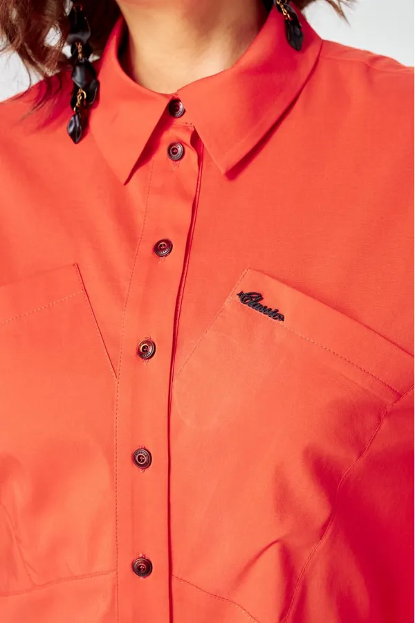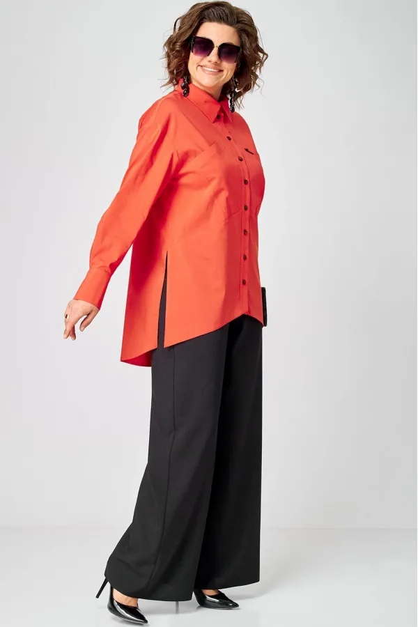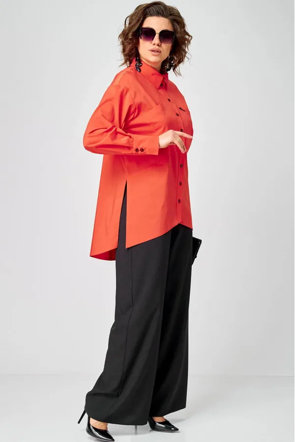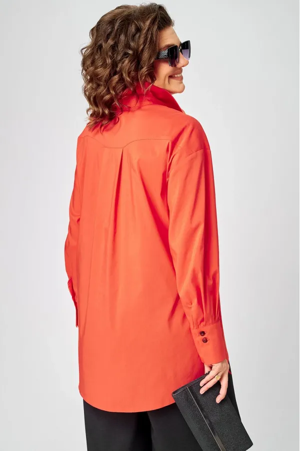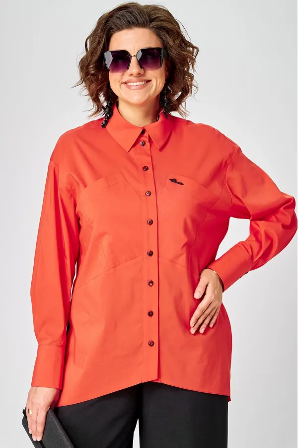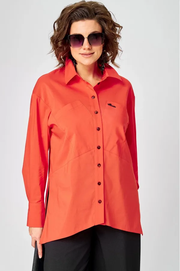 Блузка женская нарядно-повседневного элегантного стиля, прямого силуэта с фигурным низом, выполнена из шикарного дышащего однотонного хлопка. Вырез горловины воротник на стойке рубашечного типа, застежка доверху на обметанные петли и пуговицы. Рукав спущенный, втачной на притачной манжете, в боковых швах обработаны разрезы. На полочках два функциональных накладных кармана, изящная металлическая бренд-лейбл и контрастные пуговицы придают изделию стильный и современный дизайн. По спинке фигурная кокетка и встречная складка, создают идеальную посадку. Универсальный силуэт, элегантный крой, стильный дизайн - все детали только подчеркивают достоинства фигуры. а необычный цвет, создает уверенный образ.