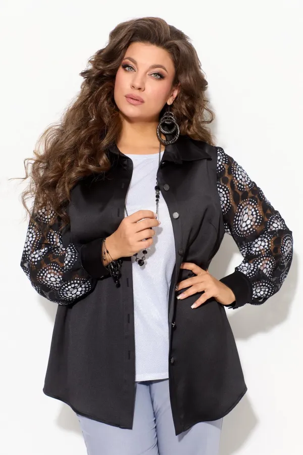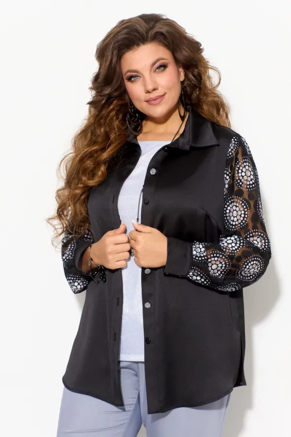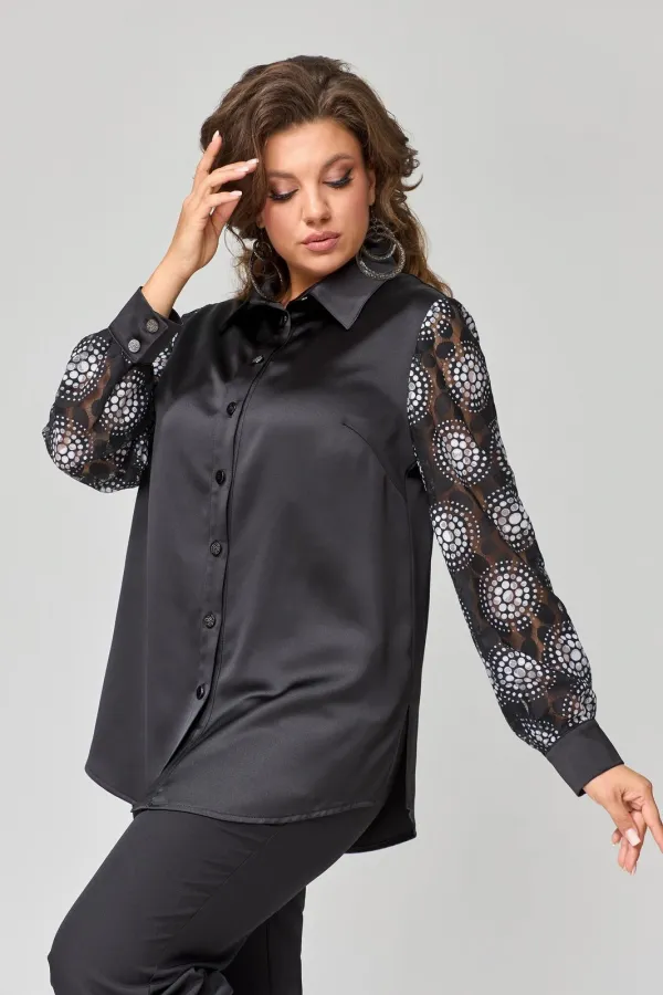 Блузка нарядная Ягла прямого силуэта, на застежку петли - пуговицы. По груди вытачка, по спинке отрезная кокетка и складка бантовая. Воротник отложной на стойке, рубашечного типа. По низу рукава манжет на застежку, низ рукава обработан манжетой на застежку на две пуговицы. По бокам разрезы, низ блузки обработан швом в подгибку. Внимание! Украшение в комплект не входит.