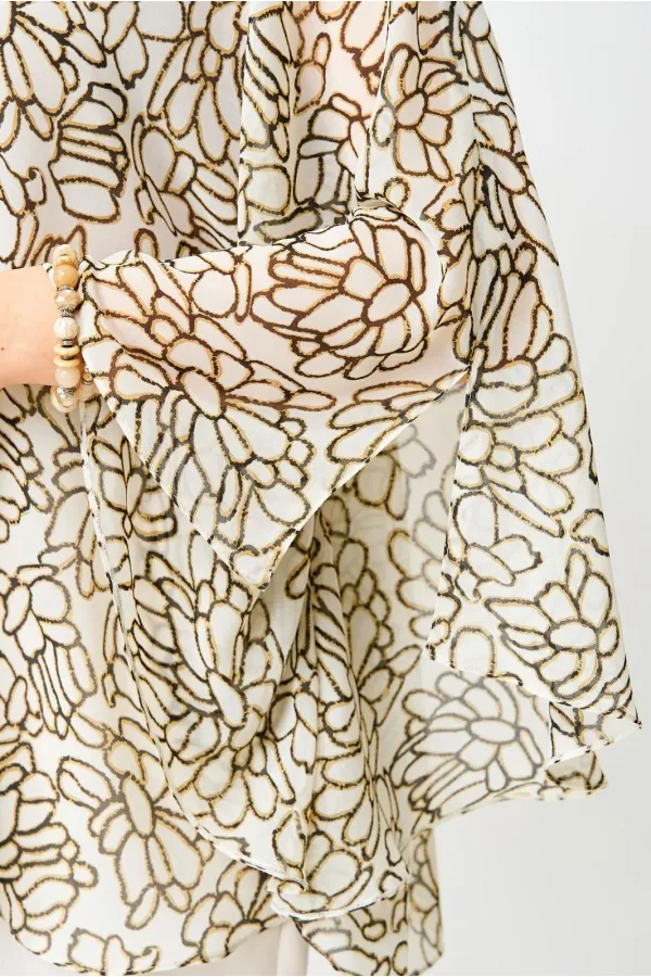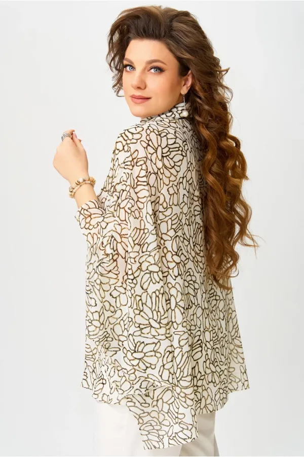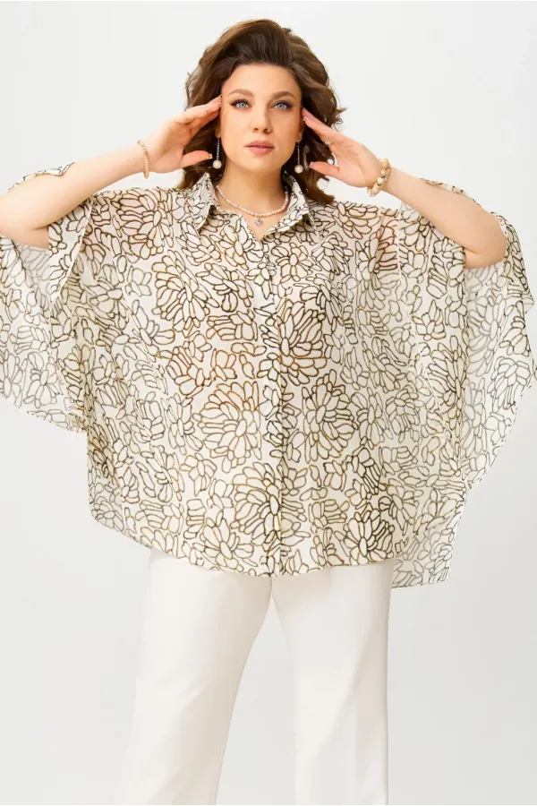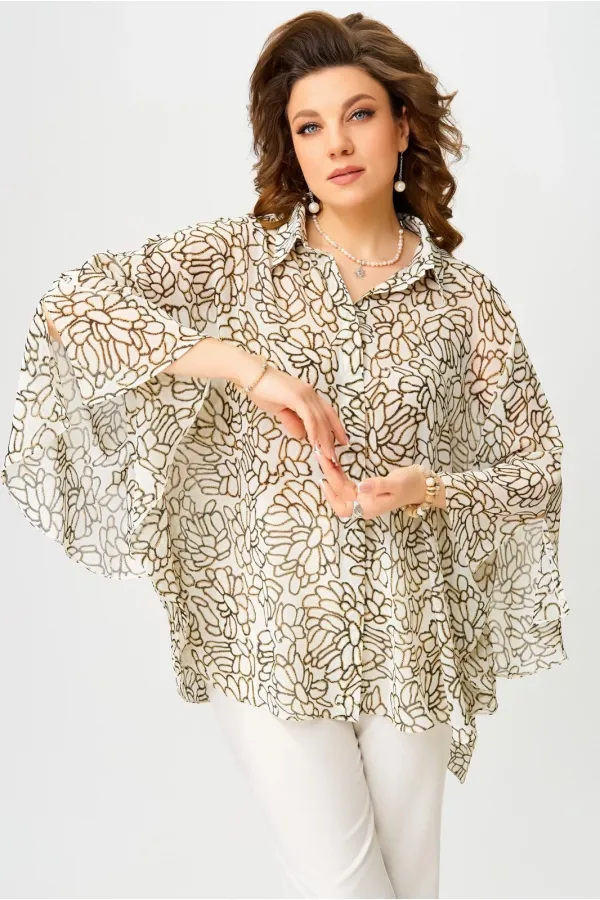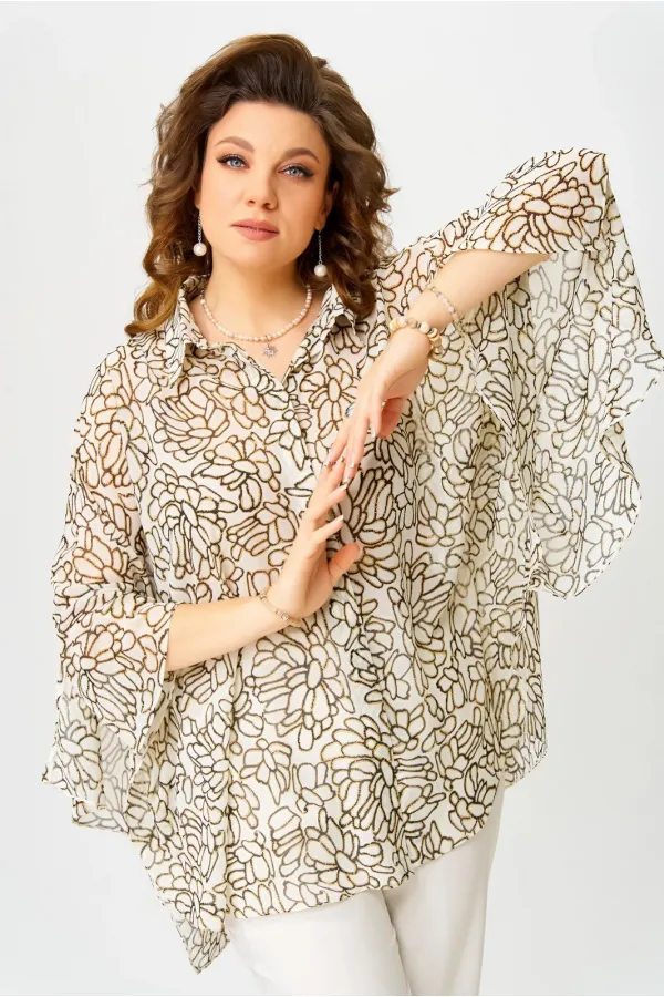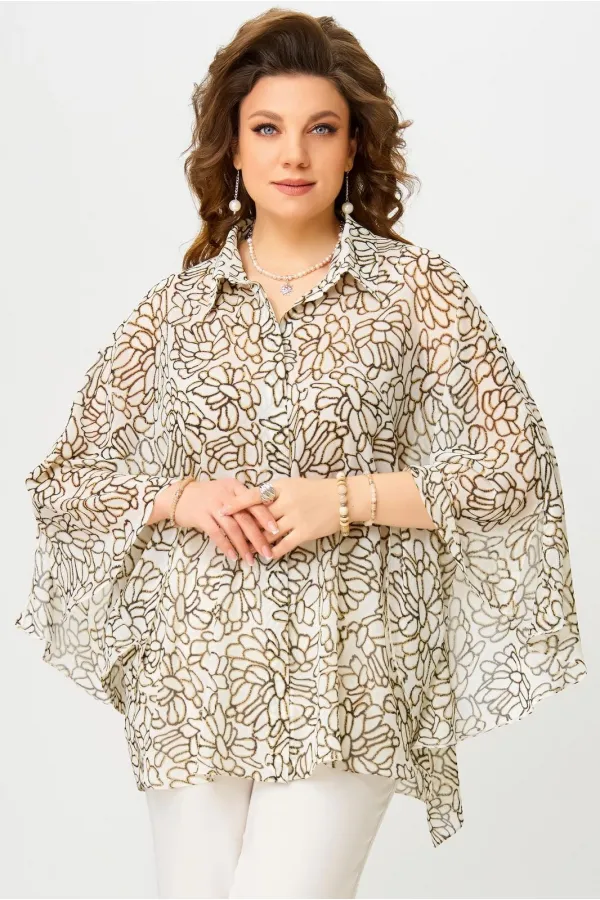 Женская блузка аля-Пугачева Ветрана выполнена из легкой шифоновой ткани. Блузка расширенная к низу. Полочка на потайную застежку на петли и пуговицы. Воротник рубашечного типа на стойке. Низ обработан швом в подгибку. Эт... Читать далее...