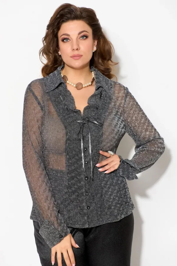 Блузка Аста нарядная, прилегающего силуэта, выполнена из жатой сетки. По горловине полочки рюша. В рюшу вставлен шнур. Застежка однобортная на навесные петли и пуговицы. Воротник отложной, на стойке, рубашечного типа. Рукав втачной, по низу рукава отложной манжет с застежкой на навесные петли и пуговицы.
