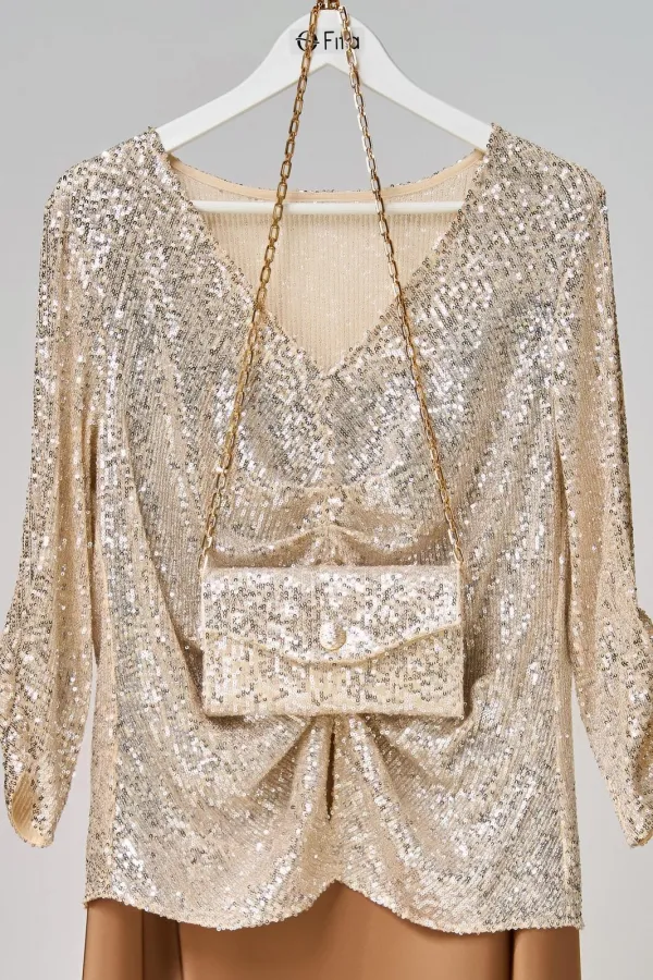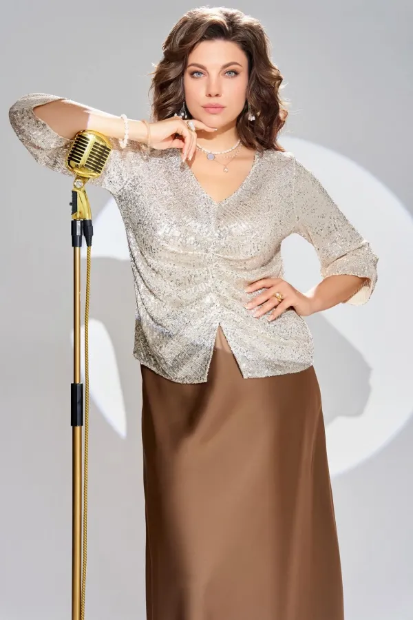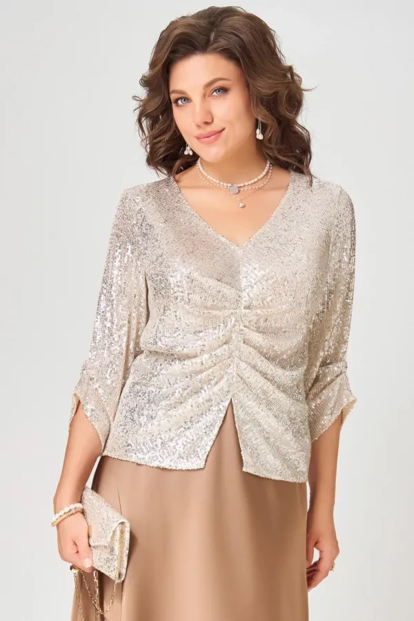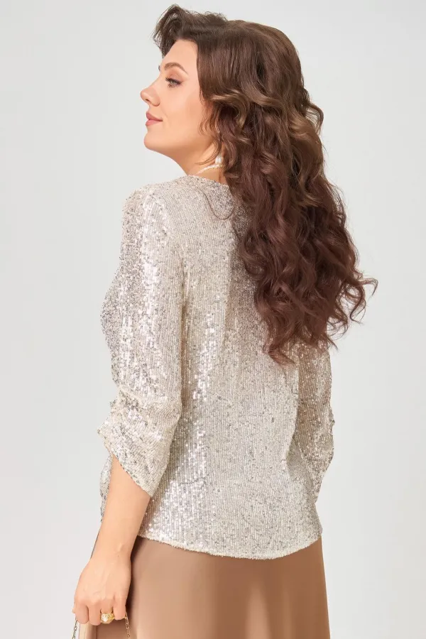Зария — сияющий акцент вашего новогоднего образа. Блузка, расшитая пайетками, ловит свет при каждом движении.