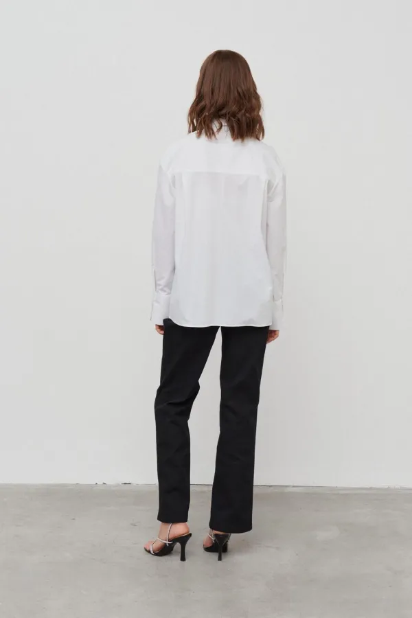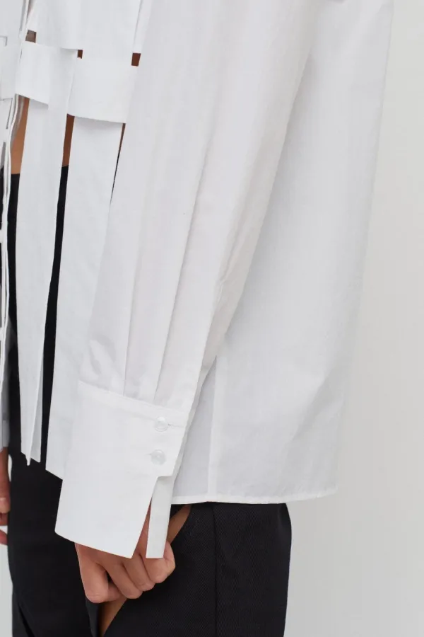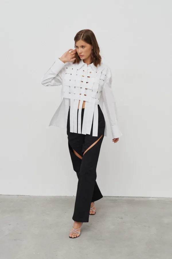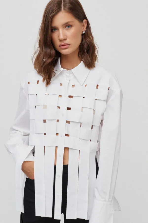 Хлопковая рубашка с дизайнерским решением по переду в виде переплетённых обтачных деталей. Линия плеча спущена, рукав с длинной манжетой, которую можно складывать пополам. Застёжка на планку с пуговицами спереди.