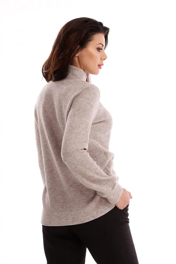 Блуза прямого покроя выполнена из мягкого трикотажного полотна, рукав втачной одношовный, заканчивается манжетой.Воротник стойка, блуза без застежки.Длина спинки по центру 65 см.Изделие не дает усадку, малосминаемое, не вытягивается.