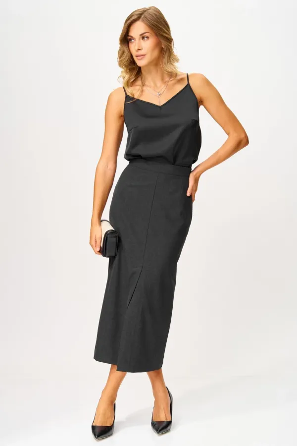 Топ на регулируемых бретелях, длиной выше линии бедер. Перед с нагрудными вытачками, в боковых швах разрезы.