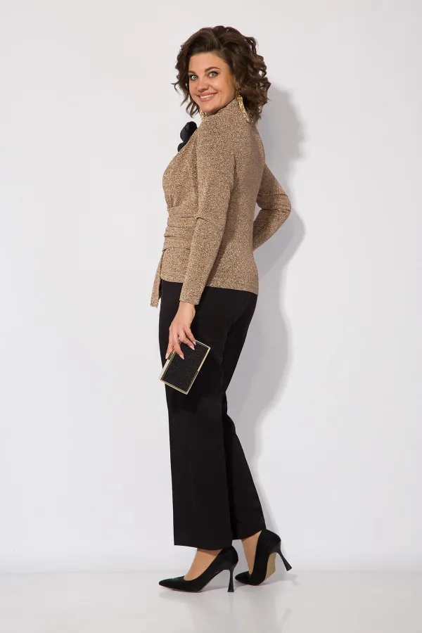 Эффектная нарядная блузка, выполнена из мягкого трикотажа с мерцающим эффектом. Такой дизайн ткани придает необычное переплетение нитей: с изнанки мягкий однотонный трикотаж! Вырез горловины мягкая стойка, переходящая в V-образный вырез с имитацией запаха. По полочке заложены декоративные складки для комфортного прилегания изделия. Низ блузки ассиметричный. Пояс декорирован задрапированным поясом из основной ткани, что зрительно стройнит и скрывает все недостатки фигуры. Рукав в точной, длинный. Спинка приталенная, без особенностей. К блузке предусмотрен съемная брошь, в виде цветка. Отлично сочетается с базовыми однотонными брюками из коллекции Лилиана.