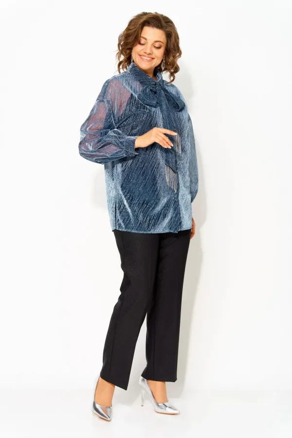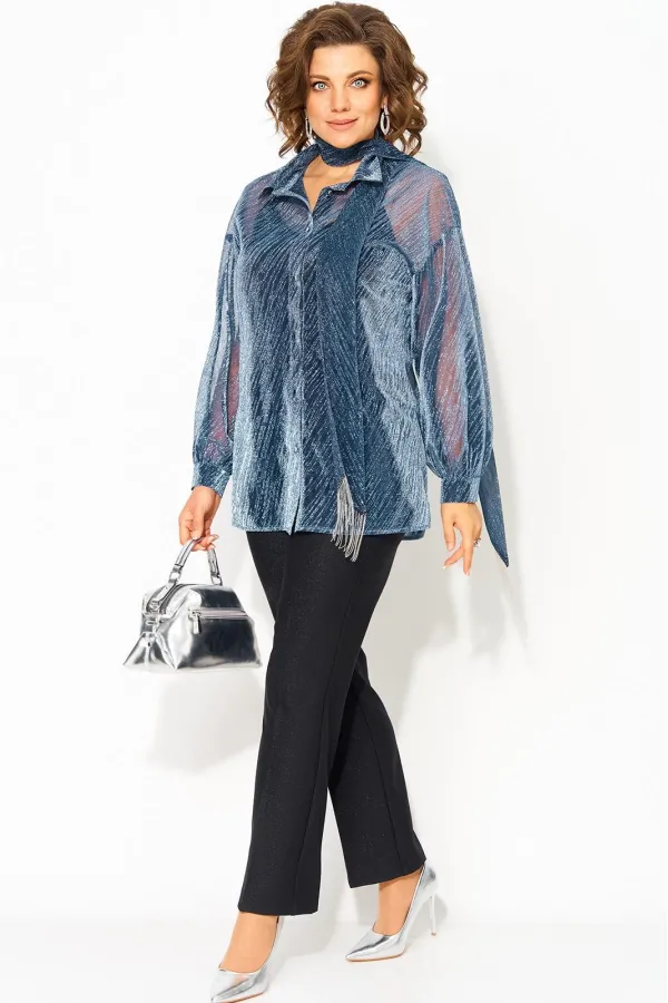 Трендовая блузка из легкой сетчатой ткани c эффектом мерцания станет стильным дополнением вашего гардероба. Ее можно комбинировать с различными элементами гардероба, накинуть поверх платья или топа. Модель выполнена с воротником-стойкой, который добавляет элегантности образу. Застежка центральная на петли и пуговицы. По бокам расположены разрезы. Свободный крой обеспечивает комфорт и подчеркивает женственность. Длинный рукав с манжетами делает ее универсальной для любого сезона, а удлиненный силуэт добавляет изысканности. В комплект входит съёмный пояс с декоративной бахромой, который может служить в виде шарфика и добавить элегантность образу.