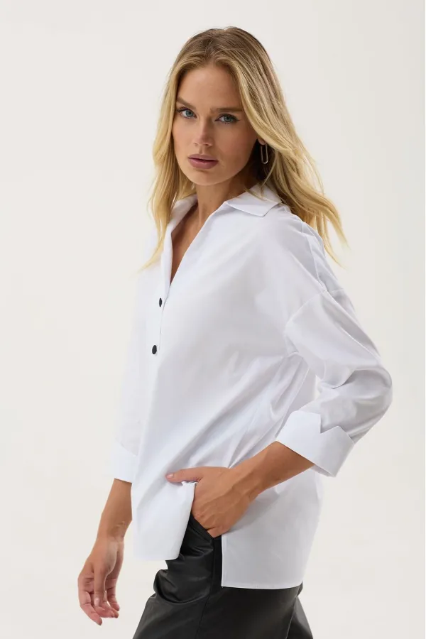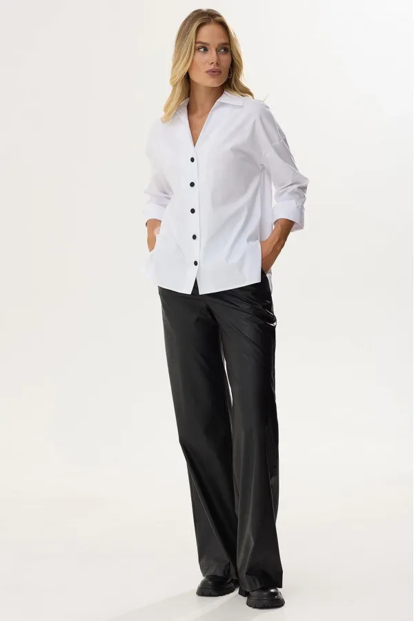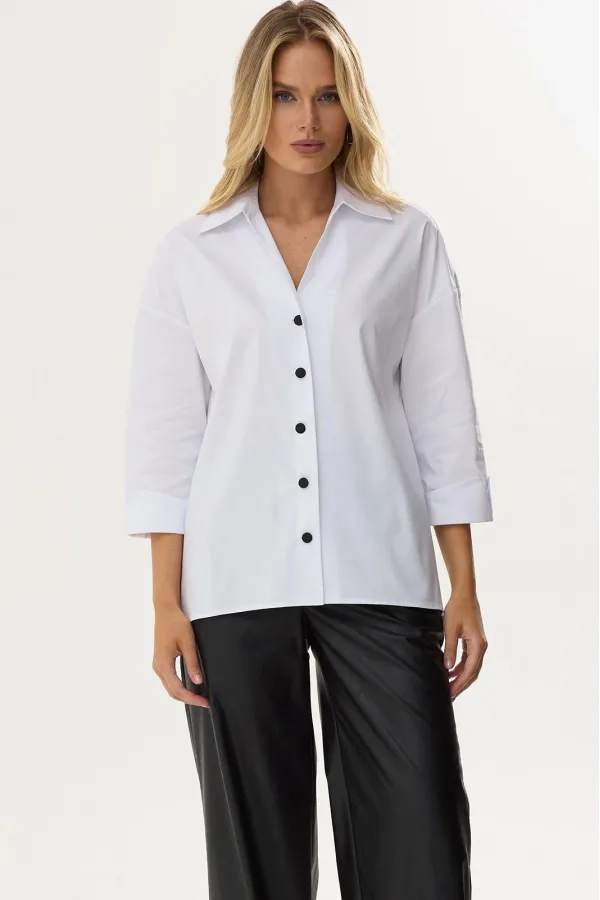 Стильная блузка прямого силуэта из хлопковой ткани с удлиненной спинкой. Воротник отложной на стойке с застежкой на петли и пуговицы. На спинке фигурный вырез с декоративной фурнитурой. На спинке кокетка со складками. В боковых швах разрезы. Обращаем ваше внимание, что фурнитура может незначительно отличаться от фото. Длина изделия: (44-48р -65см)(50-54р – 68см)(56-60р - 71см)