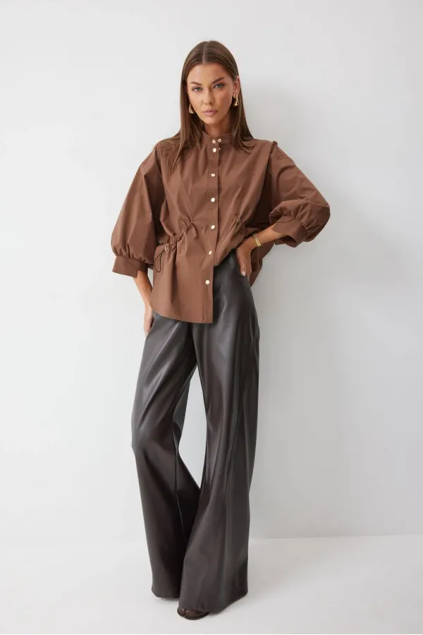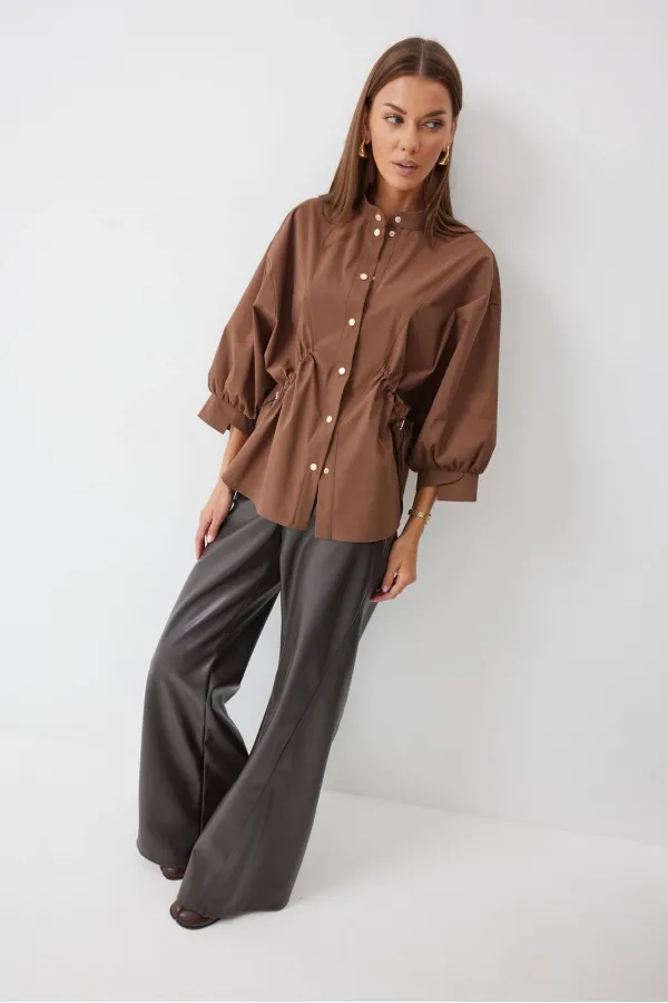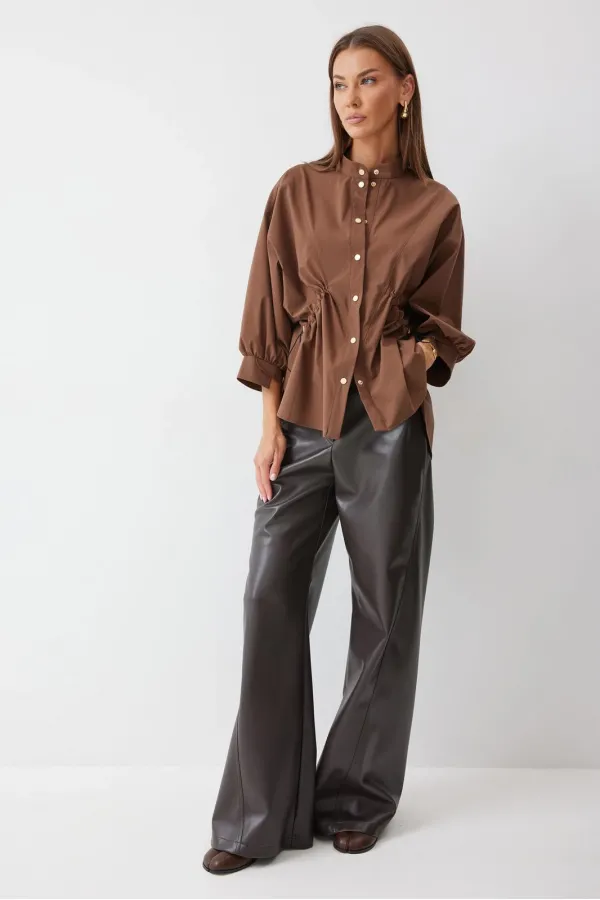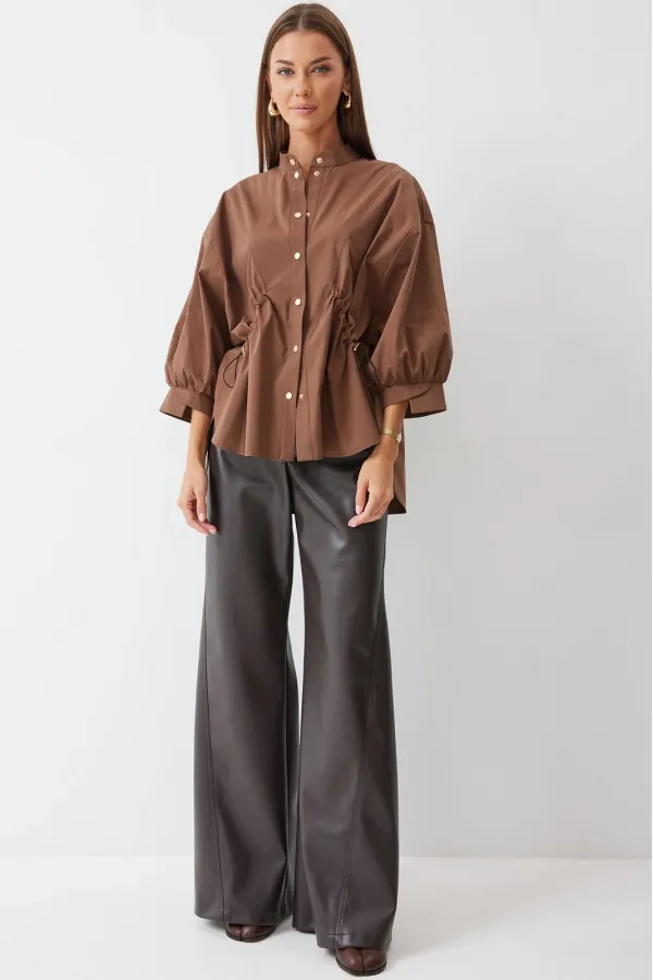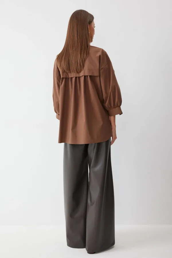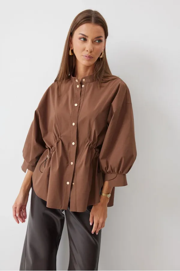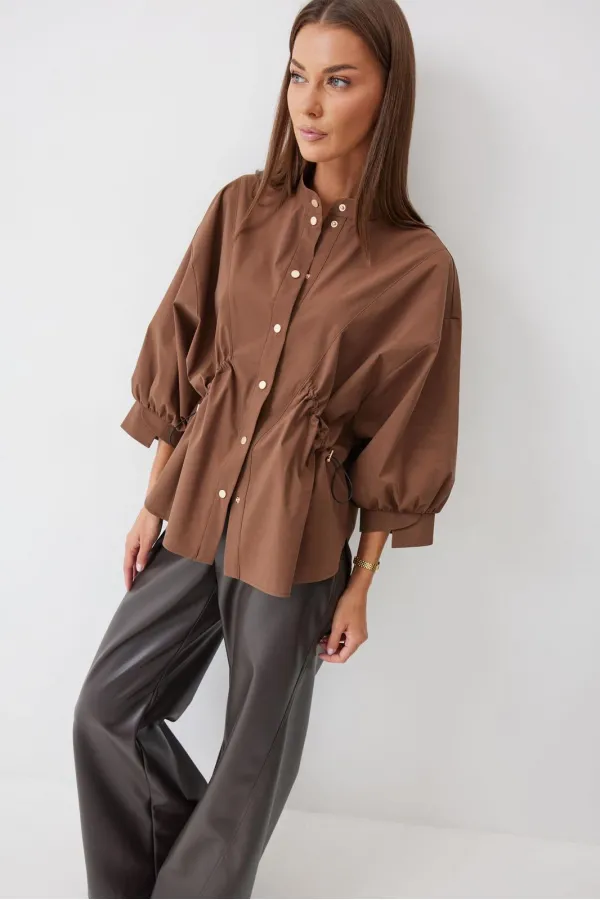 Блузка прямого силуэта из хлопковой ткани с фигурным низом. Воротник –стойка, по центру застежка на кнопки. Рукав спущенный с заниженной проймой, по низу рукава сборка и декоративная манжета. По переду декоративная кулиса с фиксаторами для регулирования степени прилегания изделия. На спинке кокетка и сборка по центру. Обращаем ваше внимание, что фурнитура может отличаться от фото.