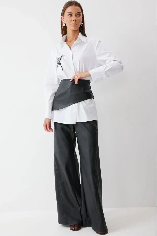 Блузка полуприлегающего силуэта. На уровне талии расположена кулиска с и завязками для регулирования степени прилегания. По центру супатная застежка, воротник рубашечный стояче-отложной. В верхней части полочки расположен накладной карман с дизайнерской печатью. Рукав втачной. Блузку дополняет съёмная деталь в виде баски из эко кожи, с шнуровкой в боковом шве.