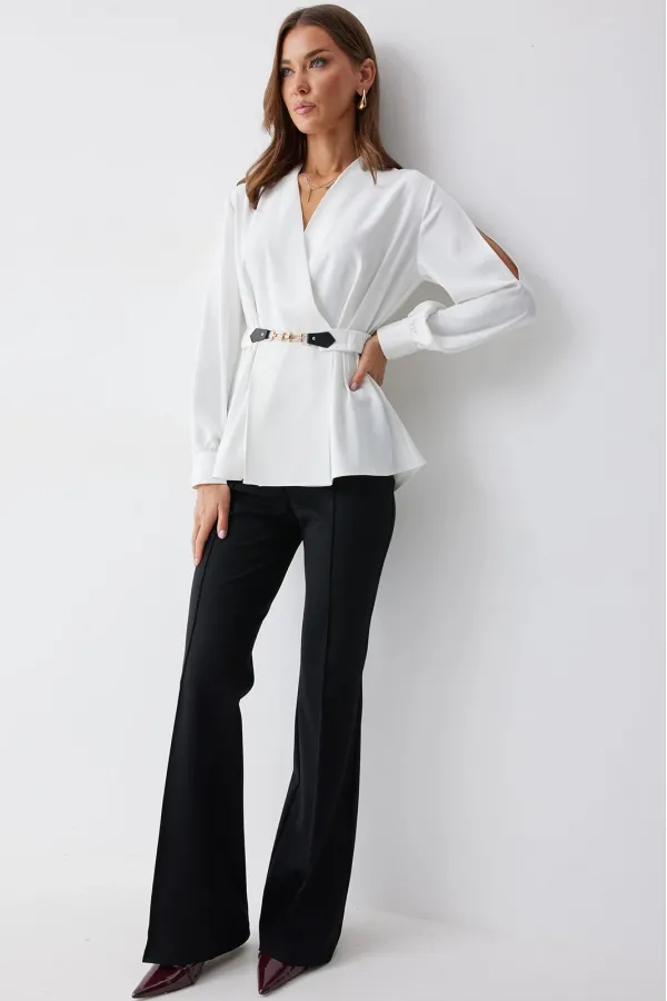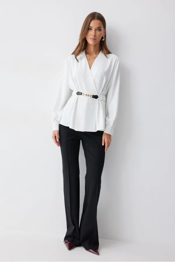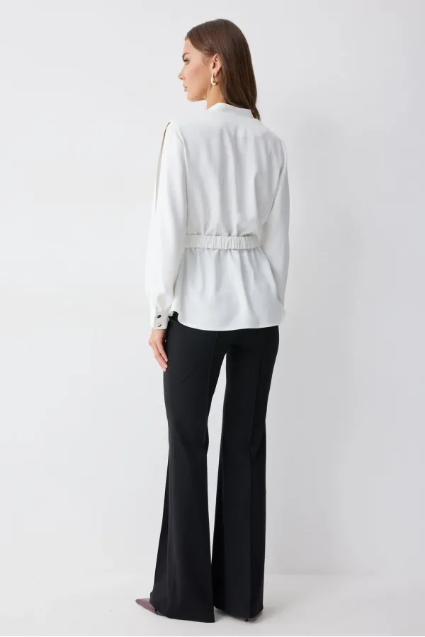 Блузка полуприлегающего силуэта расширенная книзу из струящейся ткани. Рукав втачной, с разрезом в области плеча, по низу манжета с застежкой на петли и пуговицы. Блузка отрезная по линии талии. По переду от подреза вверх и вниз декоративные складки. На спинке в подрез вставлена резинка. В комплект входит съемный ремень. Обращаем ваше внимание, что фурнитура может отличаться от фото.