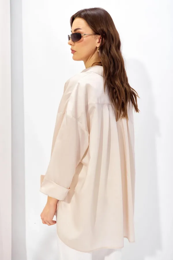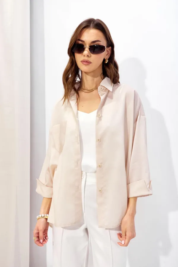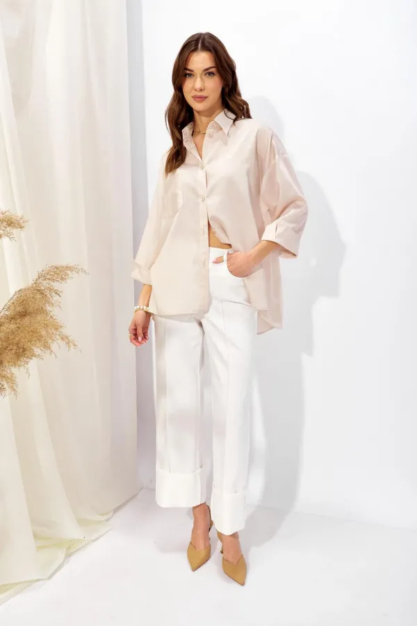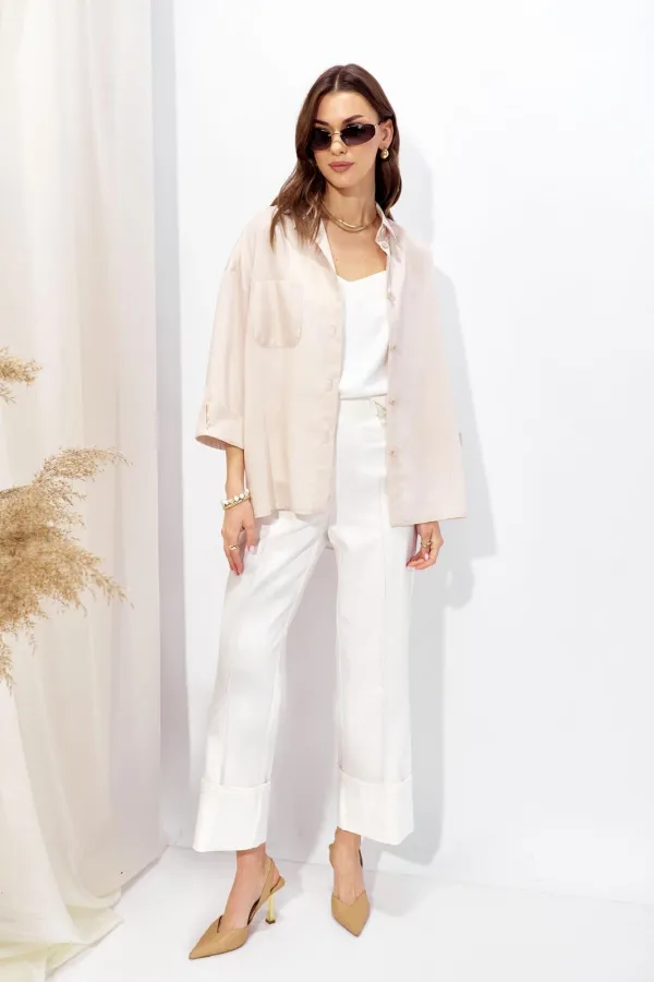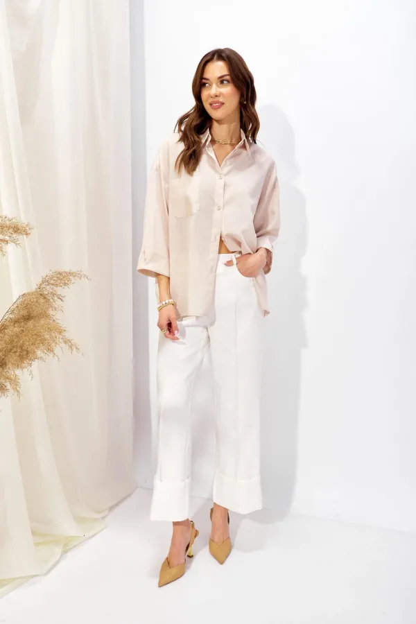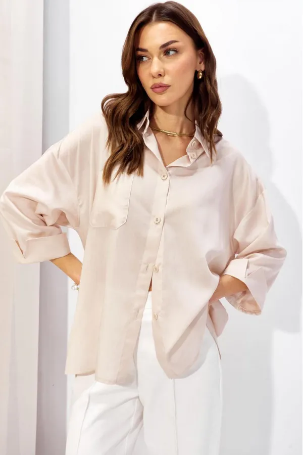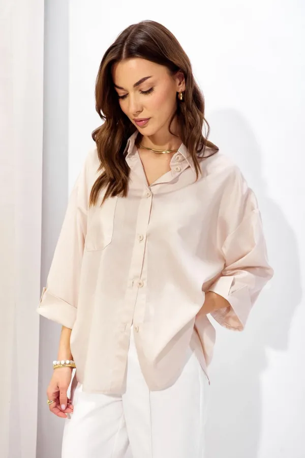 Блузка прямого силуэта из натуральной ткани с добавлением вискозы с фигурным низом. Воротник рубашечного типа с застежкой по центру на петли и пуговицы. По переду накладной карман. Рукав со спущенной линией плеча длиной 7/8 , по низу манжета. На спинке кокетка с декоративными складками. В боковых швах блузки по низу разрезы.