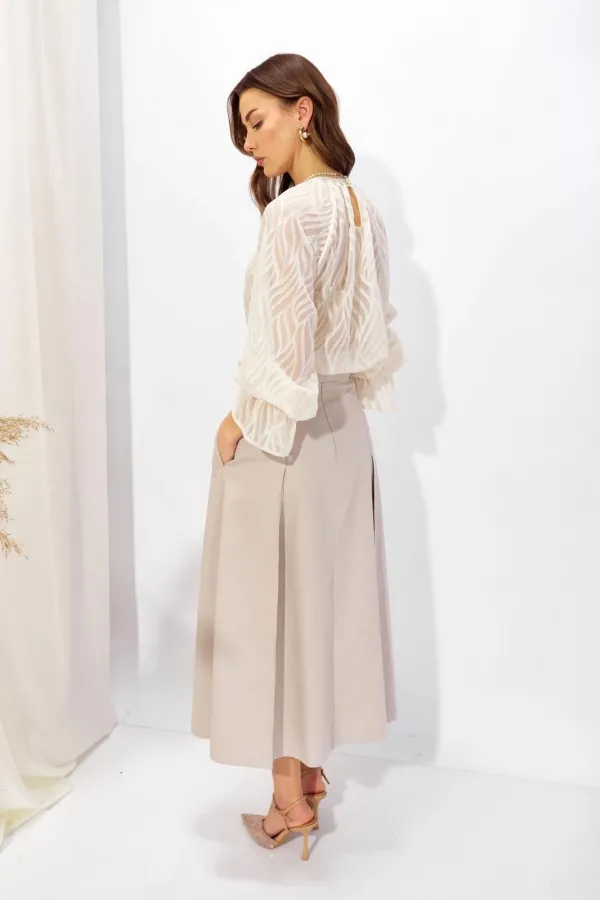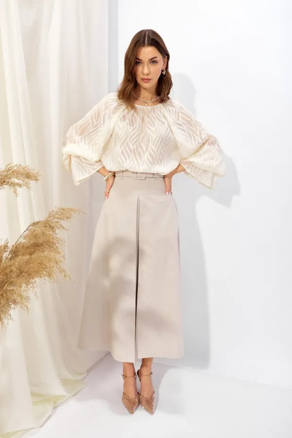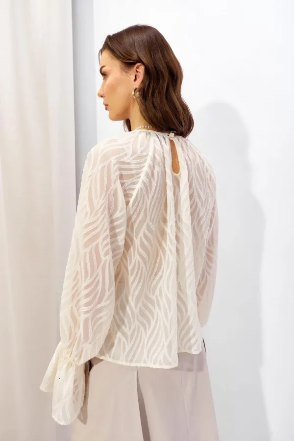 Блузка прямого силуэта из полупрозрачной блузочной ткани. Горловина округлая со сборкой, на спинке разрез “капля” с застежкой на петлю и пуговицу. Рукав покроя реглан удлиненный, по низу манжета.