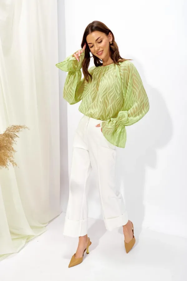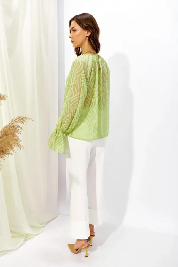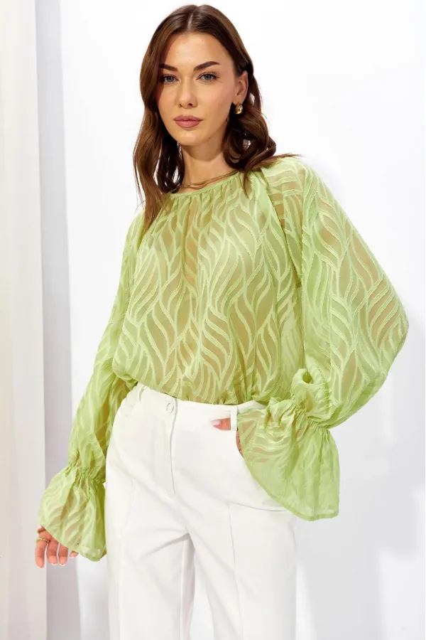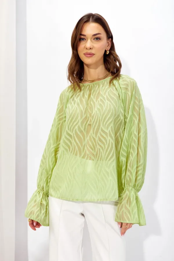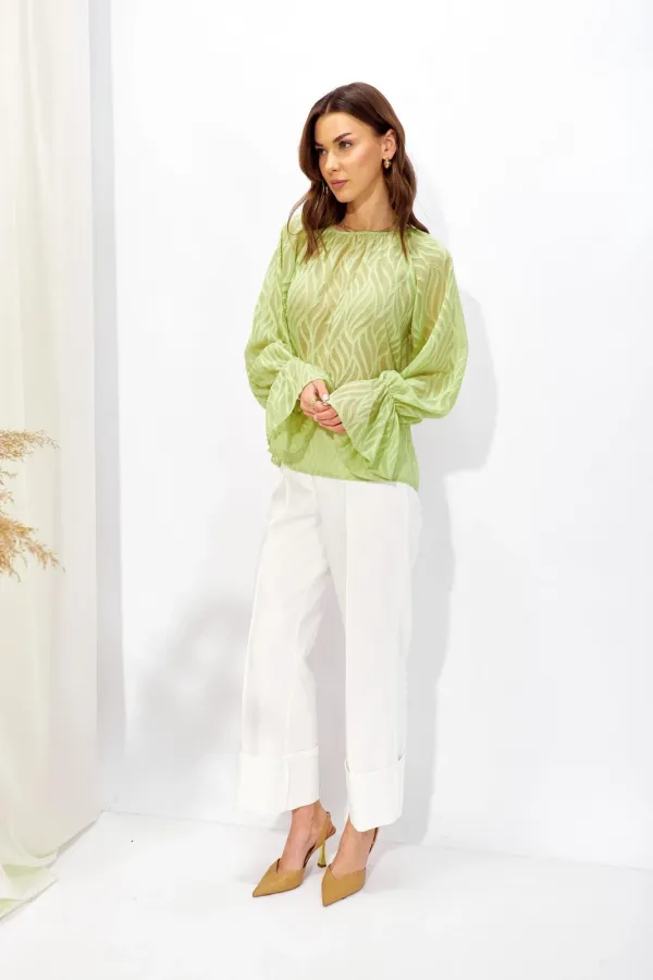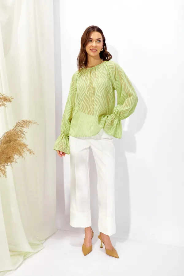Блузка прямого силуэта из полупрозрачной блузочной ткани. Горловина округлая со сборкой, на спинке разрез “капля” с застежкой на петлю и пуговицу. Рукав покроя реглан удлиненный, по низу манжета.