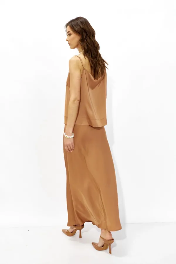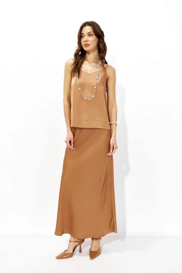 Базовый топ в бельевом стиле из струящейся ткани прямого силуэта с V-образным вырезом на тонких регулируемых бретелях. Его можно носить отдельно или в многослойных образах.