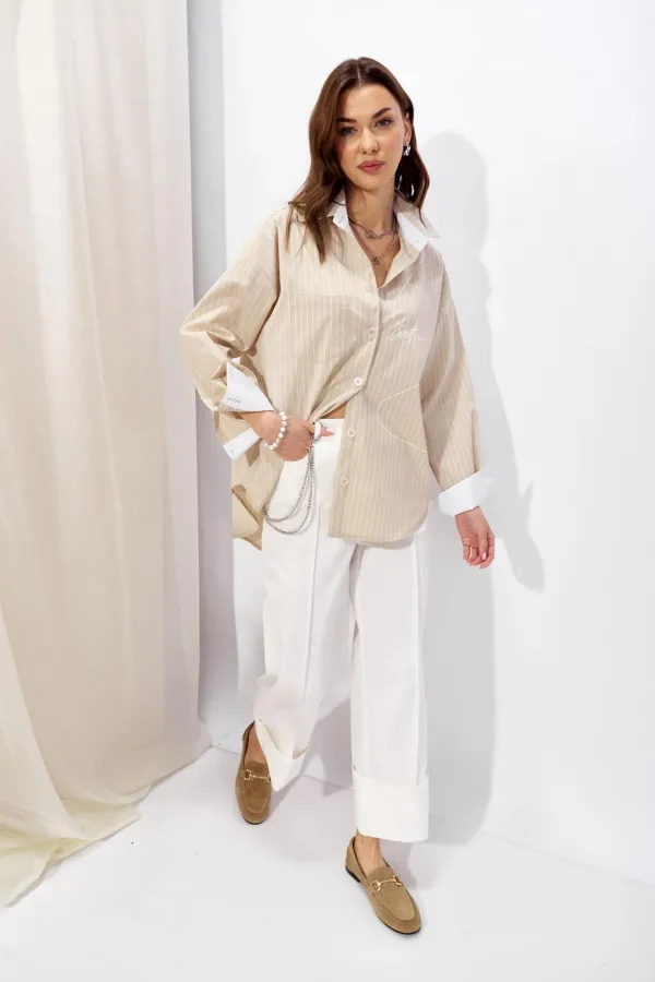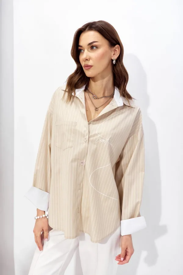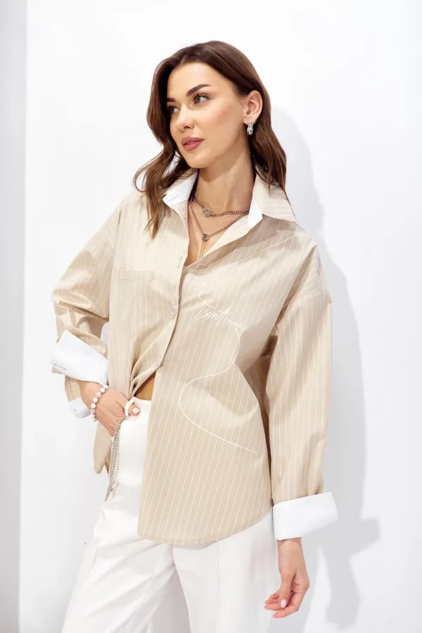 Блузка прямого силуэта из рубашечной ткани с фигурным низом. Воротник на стойке с застежкой по центру на петли и пуговицы. Рукав со спущенной линией плеча, по низу манжета с застежкой на петлю и пуговицу. На спинке кокетка с декоративными складками. По переду дизайнерская печать. Обращаем ваше внимание, что фурнитура может отличаться от фото.